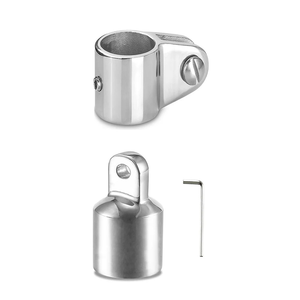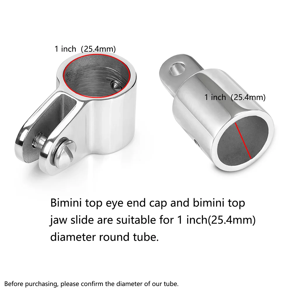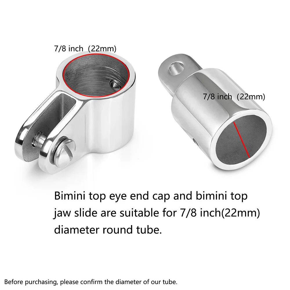 This marine grade 316 stainless steel bimini top jaw slide and eye end cap is designed to fit various sizes of round tubes (19/22/25.4/32 mm DE). The high-quality material ensures durability and resistance to corrosion in marine environments. This hardware is ideal for securing bimini tops on boats or other watercraft. The jaw slide and eye end cap provide a secure connection for the bimini top, offering reliable protection from the elements while out on the water. This product is a reliable and long-lasting solution for boat owners looking to upgrade or replace their bimini top hardware.