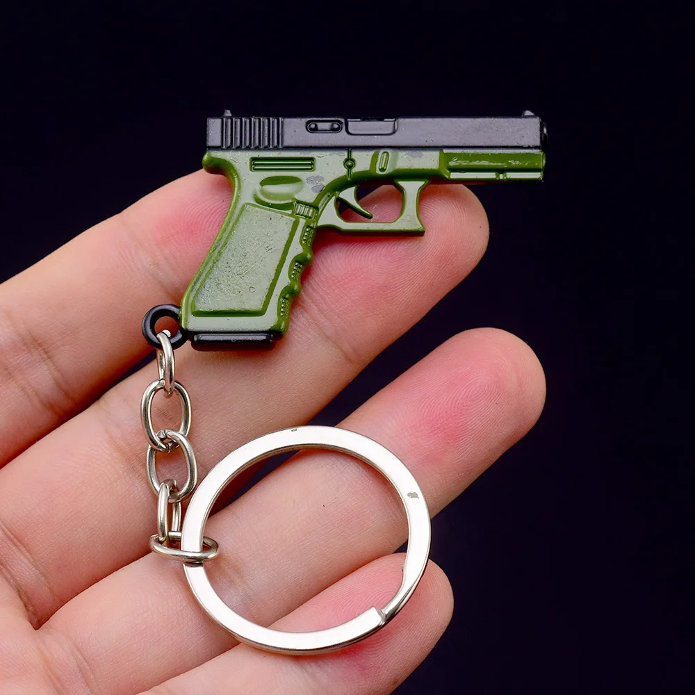 Le contenu décrit un porte-clés en métal Glock en forme de pistolet miniature. Il est fabriqué en alliage et sert de pendentif cadeau de jouet décoratif pour le bureau ou les clés. Le porte-clés est conçu pour ressembler à une vraie arme à feu et constitue un accessoire élégant pour les amateurs d'armes à feu ou les collectionneurs.. Il est compact et léger, ce qui le rend facile à transporter. Ce modèle de porte-clés ajoute une touche unique et audacieuse à n'importe quel jeu de clés ou bureau..