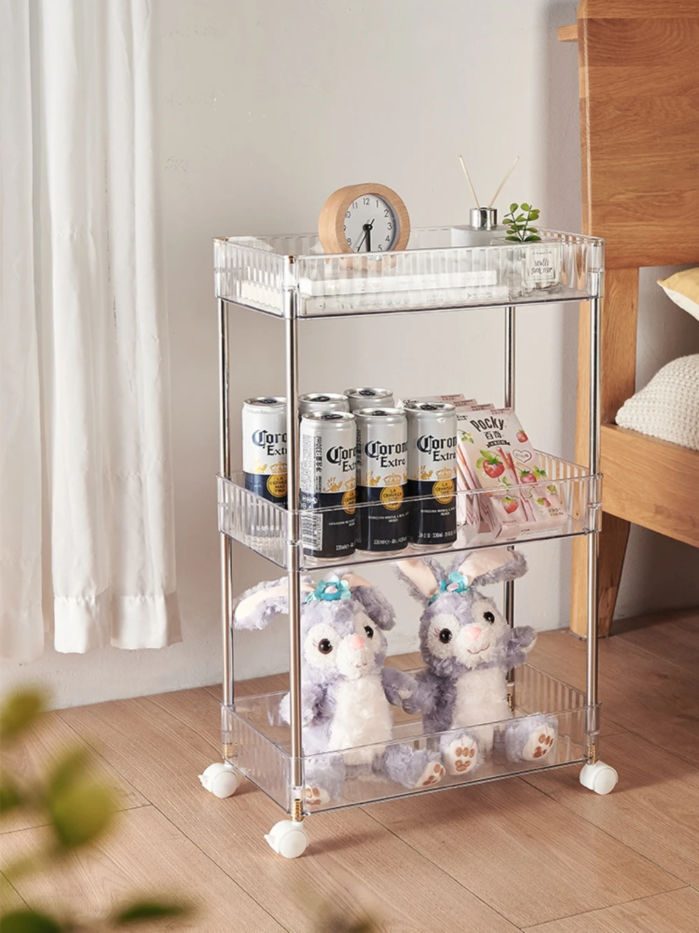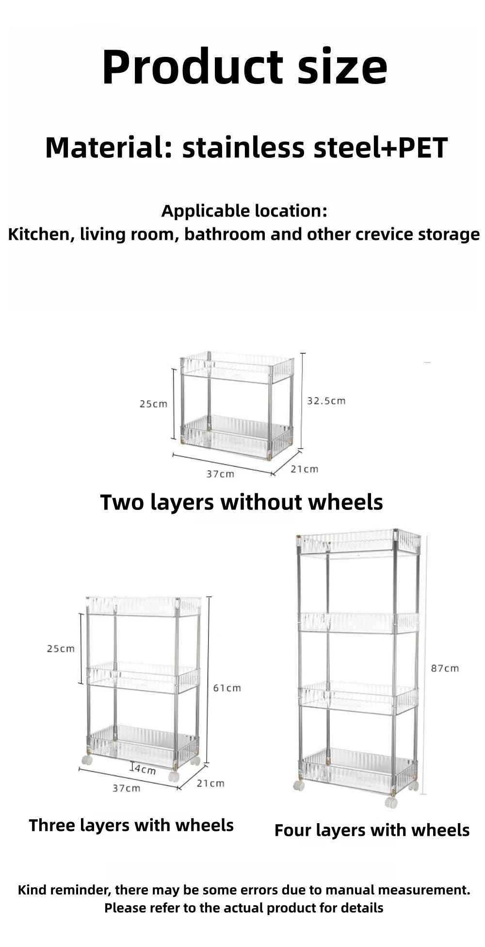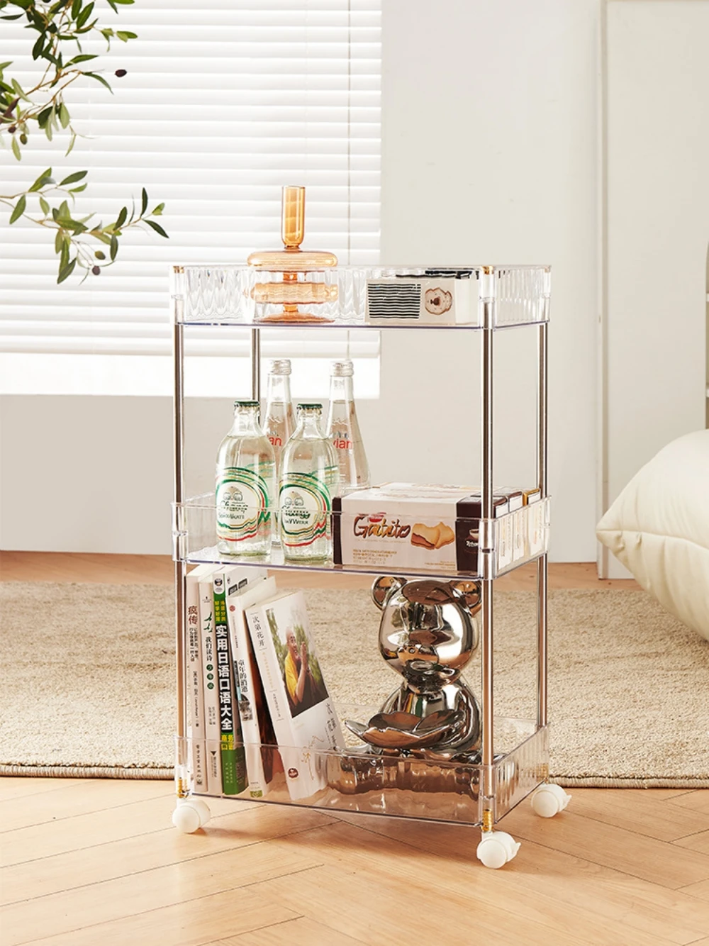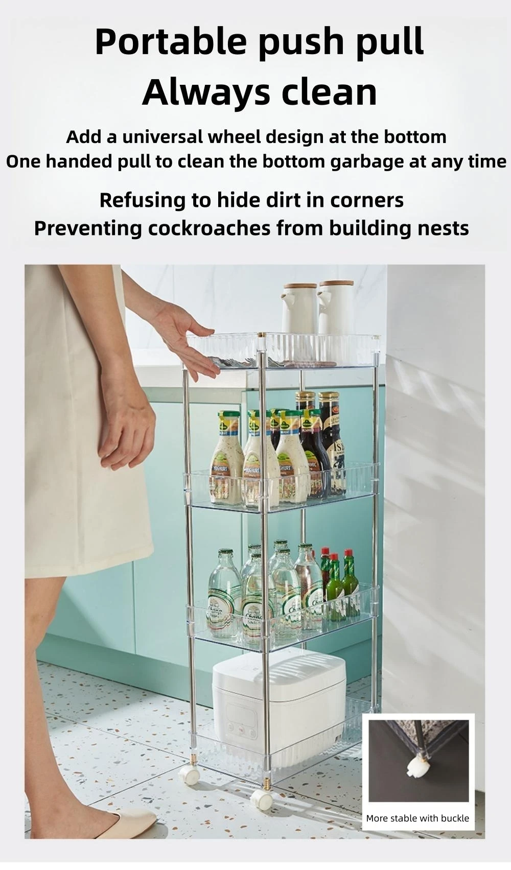Le contenu décrit un petit, transparent cart with multiple layers that can be easily moved around on the floor. It is designed for use in various rooms such as the living room, cuisine, and bathroom to provide storage for miscellaneous items. The cart is compact and see-through, allowing for easy access to stored items while keeping things organized. Its versatile design makes it a convenient storage solution for different areas of the home.