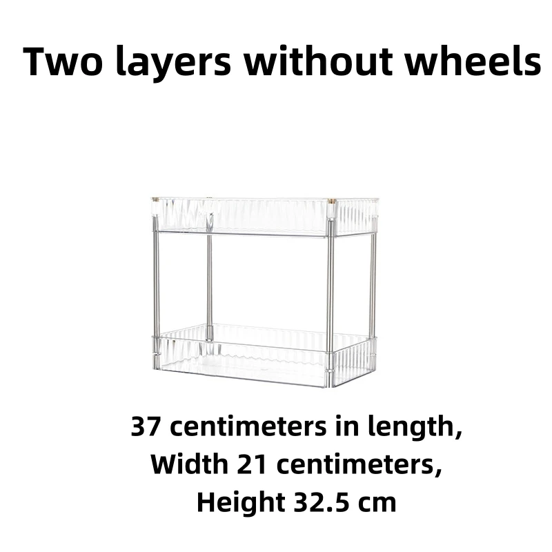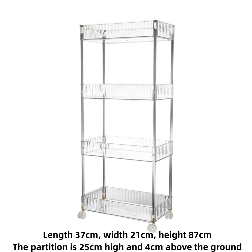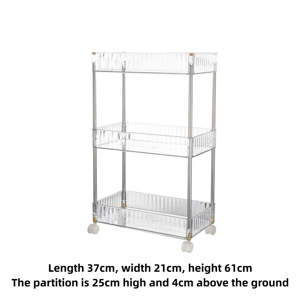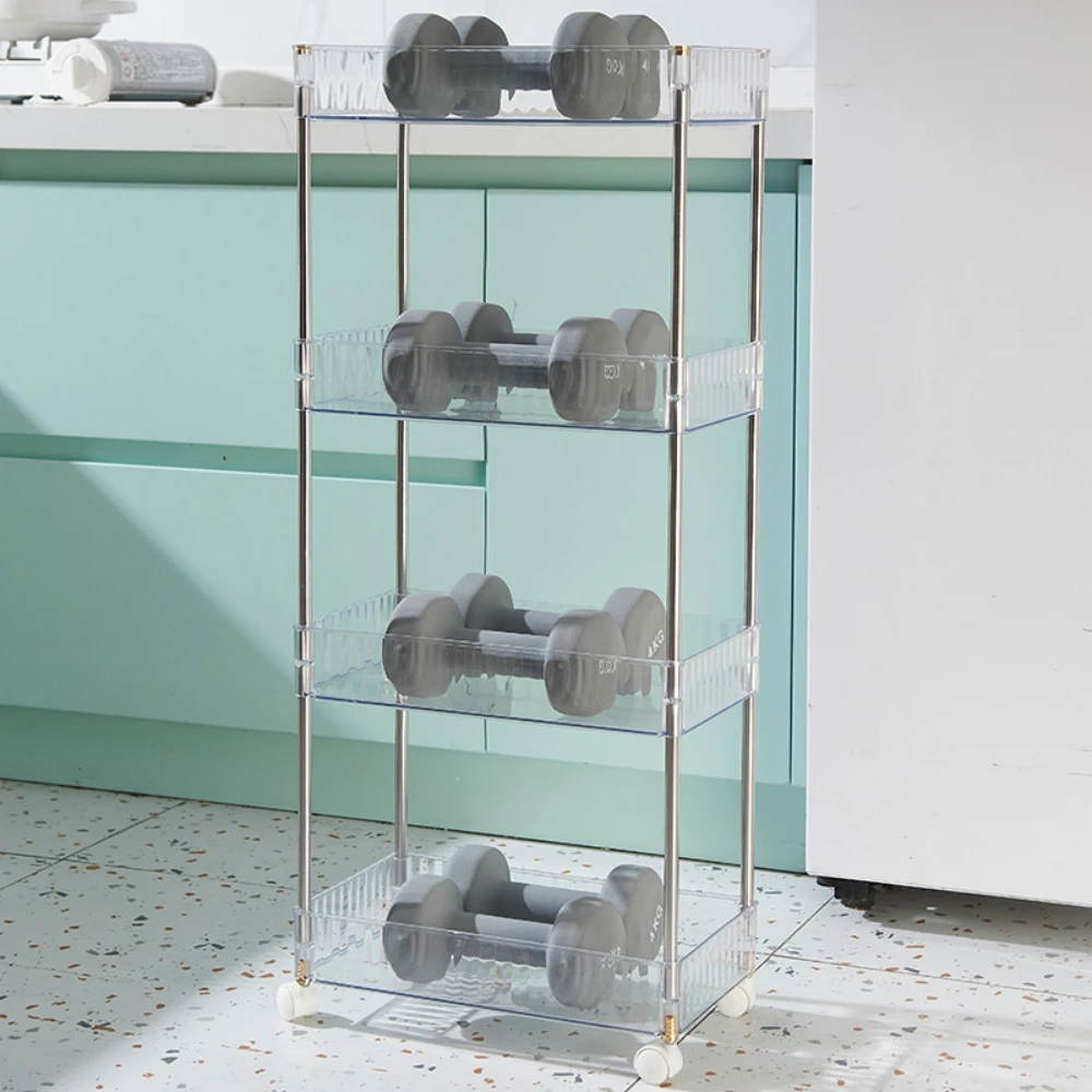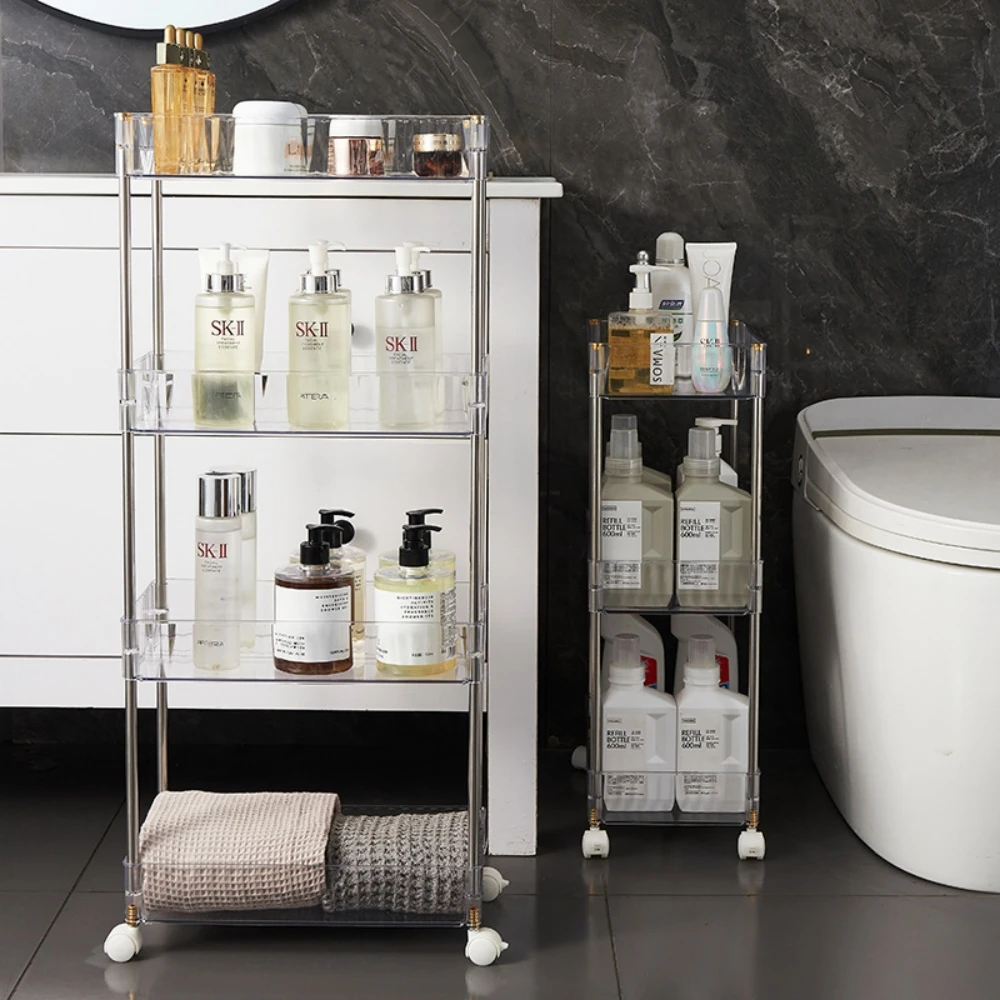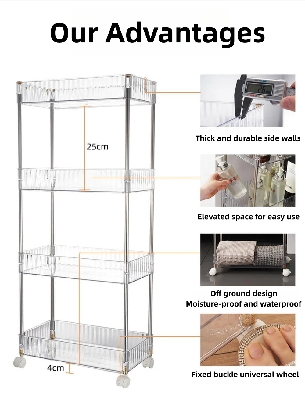 Le contenu décrit un petit, transparent cart with multiple layers that can be easily moved around on the floor. It is designed for use in various rooms such as the living room, cuisine, and bathroom to provide storage for miscellaneous items. The cart is compact and see-through, allowing for easy access to stored items while keeping things organized. Its versatile design makes it a convenient storage solution for different areas of the home.