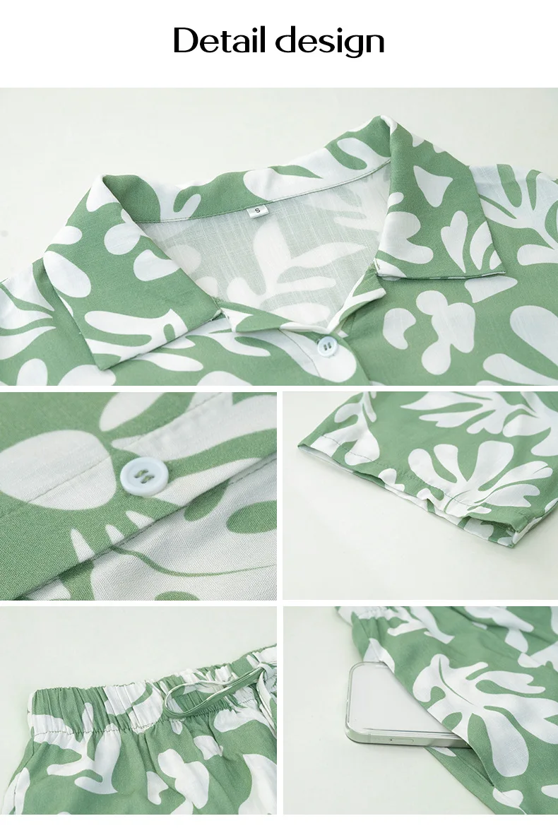 Ce contenu décrit une femme’s casual summer outfit set for a beach vacation. The set includes a short-sleeve shirt with a print design and matching shorts. The outfit is loose-fitting and comfortable, perfect for a holiday or vacation. This two-piece set is ideal for warm weather and can be worn for a relaxed and stylish look. It is a versatile outfit that can be worn during the day at the beach or for casual outings.