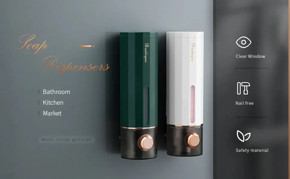 • Dispensateur mural :Économise de l'espace et maintient le savon et le désinfectant à portée. Idéal pour une utilisation dans les salles de bains, cuisines, et les hôtels.