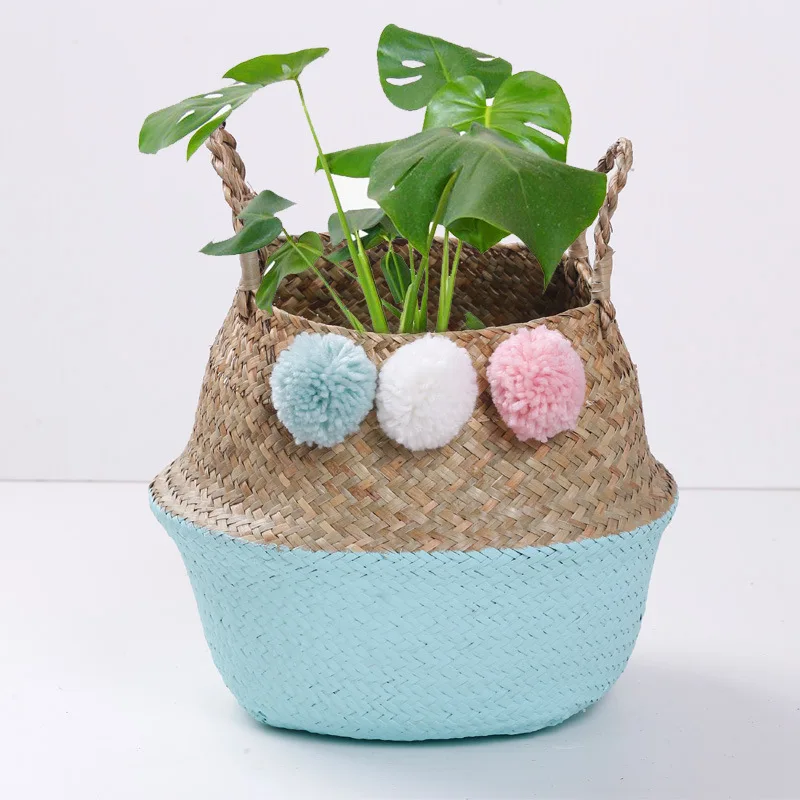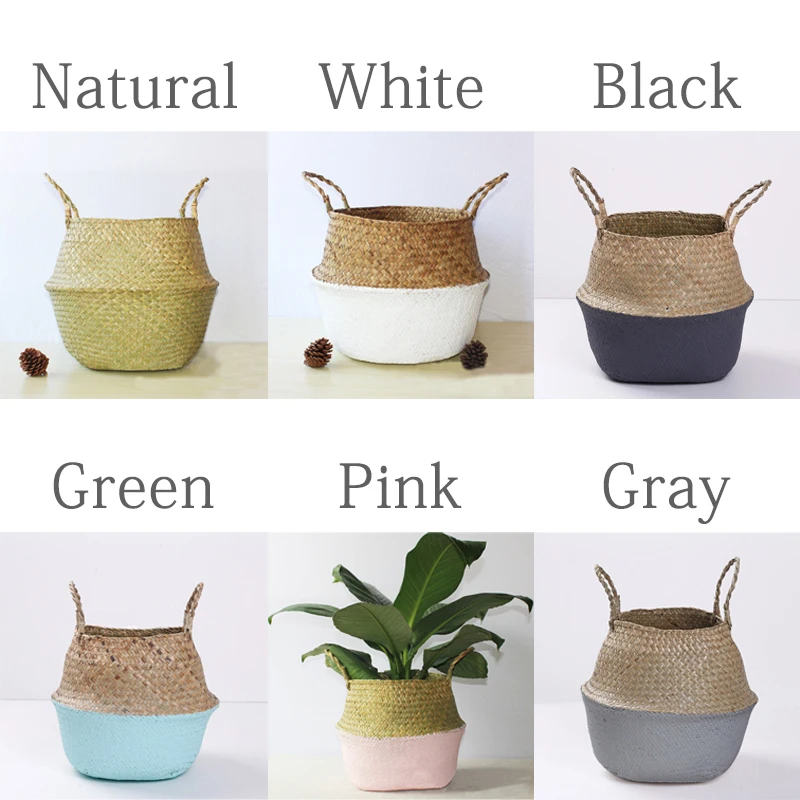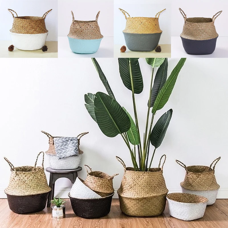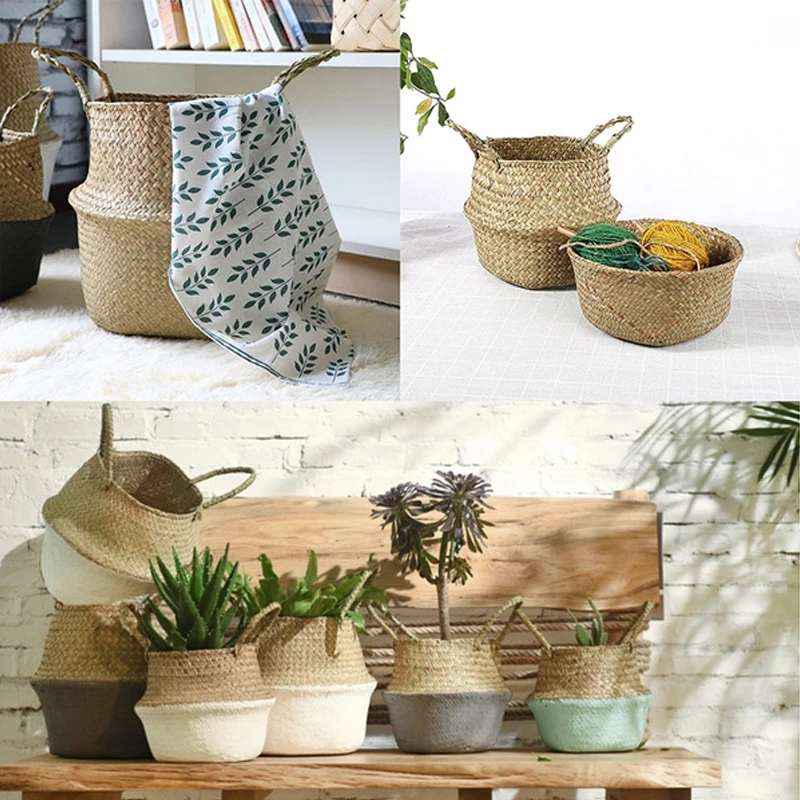 This is a natural seagrass handmade storage basket that can be used for folding clothes, lessive, storing flowers, or as a beach bag. It is made of straw, osier, and rattan, and can be folded when not in use. The basket is woven and has a rustic look. It is versatile and can be used in various ways for organizing and storing items. The material used is eco-friendly and durable. This basket is a stylish and practical addition to any home.