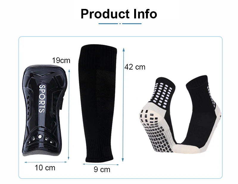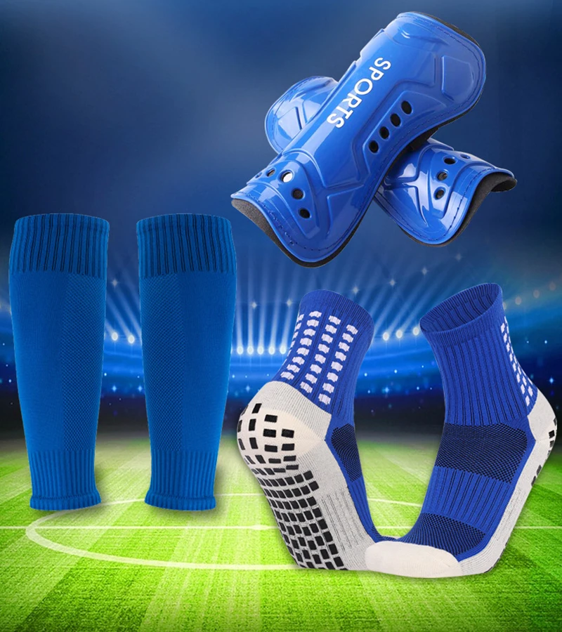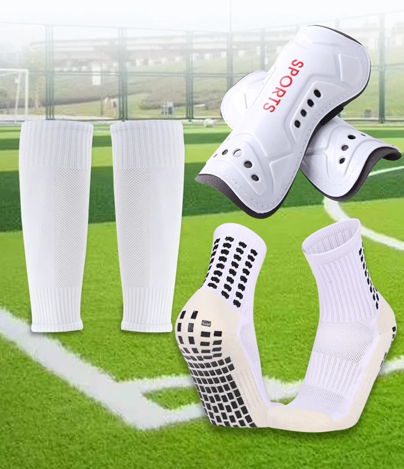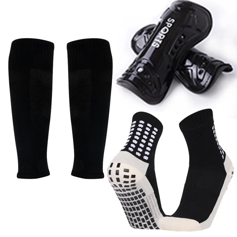 This content describes a 3-piece set including anti-slip grip socks and shin guards specifically designed for football and soccer players. These items are paired together to provide maximum protection and support during gameplay. The anti-slip grips socks help players maintain stability on the field, while the shin guards and sleeves offer protection against potential injuries. This set is ideal for athletes looking to enhance their performance and stay safe during matches.
