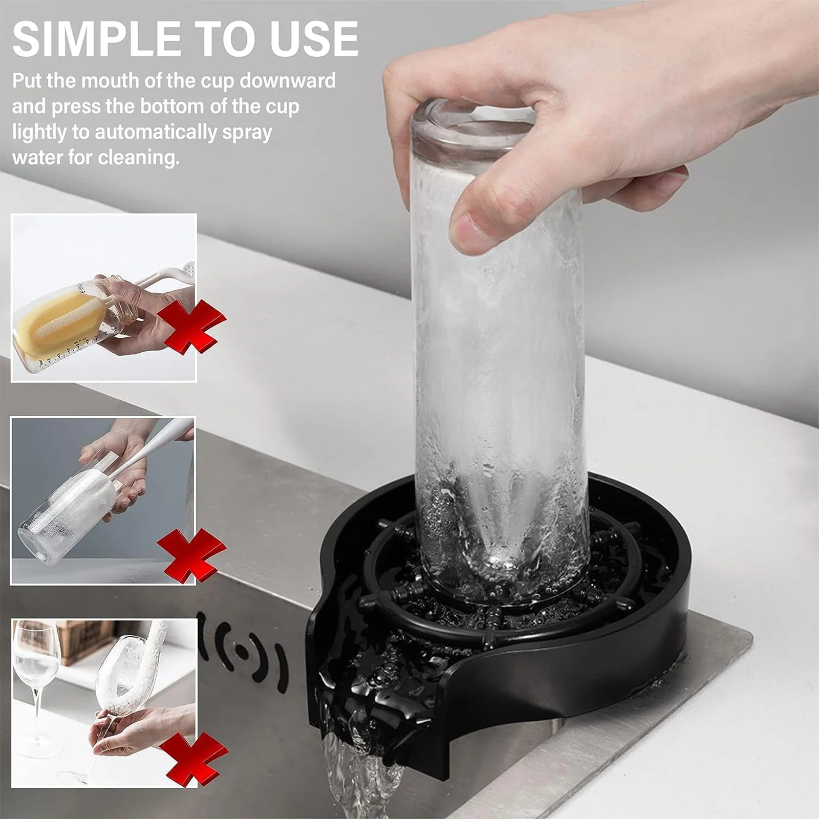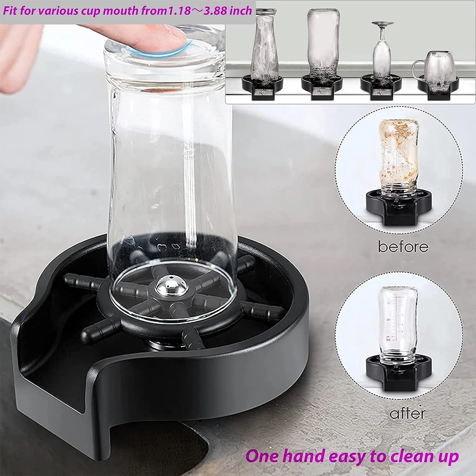 Introducing our ABS High Pressure Automatic Glass Cup Washer, designed to make cleaning your glassware a breeze in the kitchen sink. This innovative gadget is perfect for quickly and efficiently washing all types of glass cups with high pressure water jets.