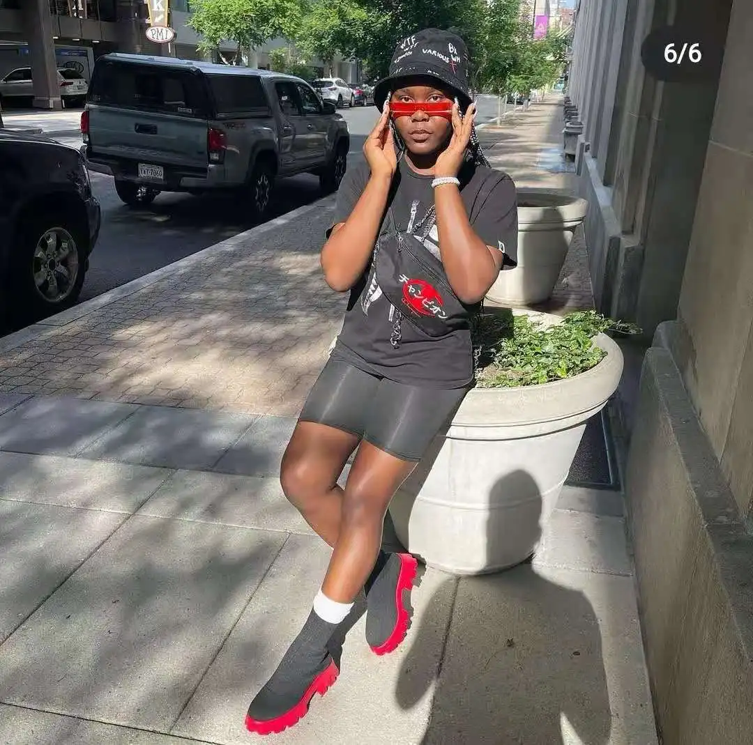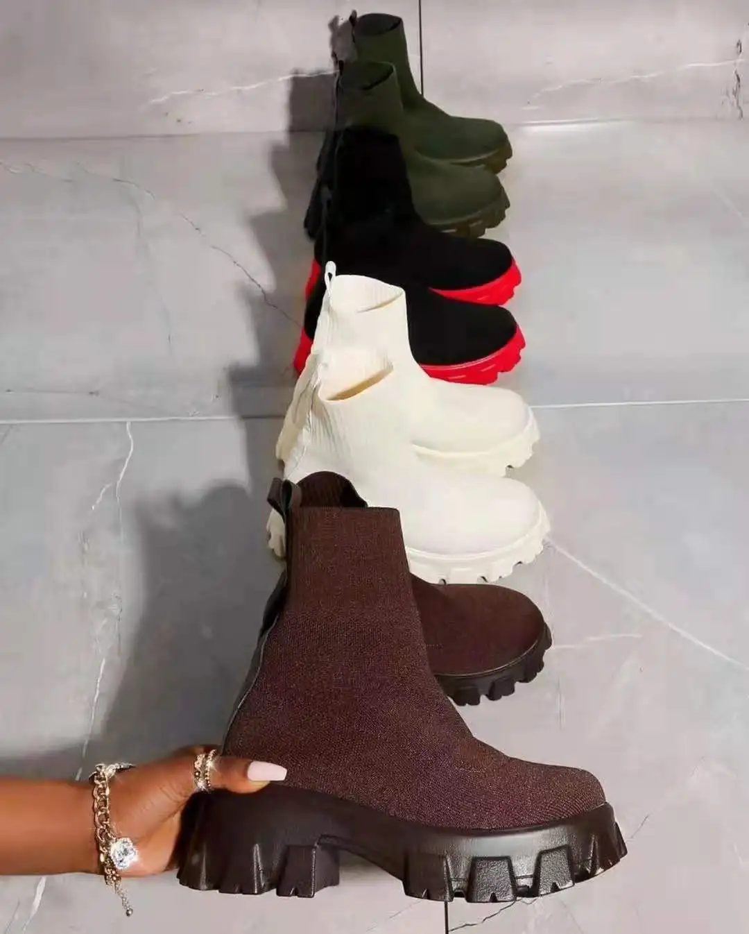 These are stylish platform boots for women made of stretch fabric with a casual mid-calf height. They feature a net red knitted design, perfect for autumn fashion. These short boots are comfortable and perfect for daily wear. They come in plus sizes, making them accessible to a wide range of customers. Complessivamente, these fashionable boots are perfect for adding a trendy touch to any outfit during the fall season.