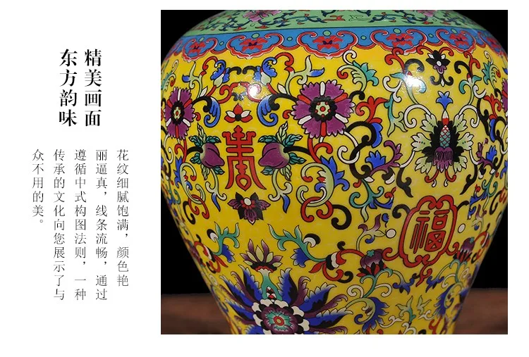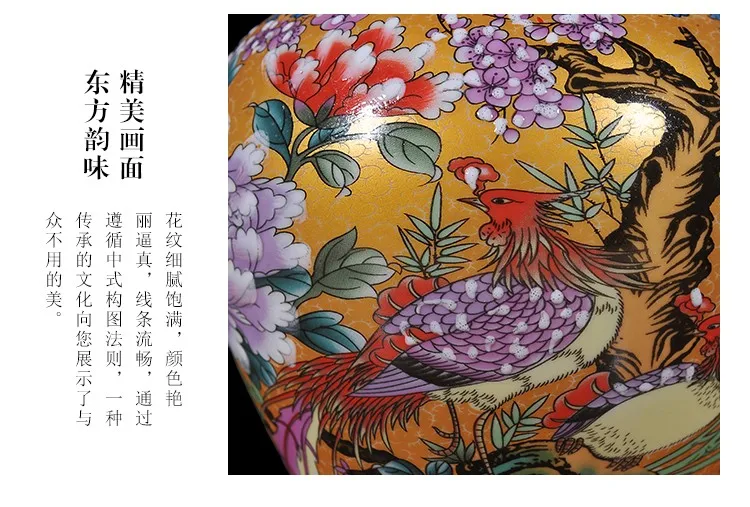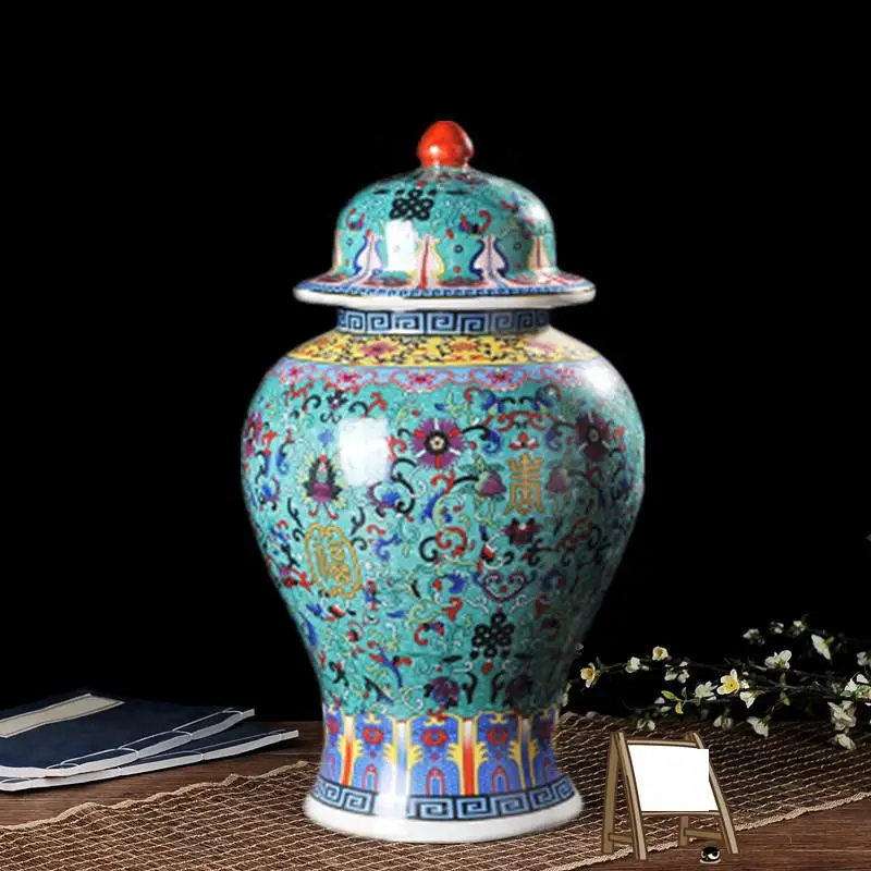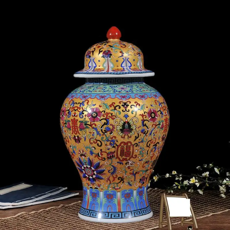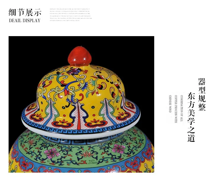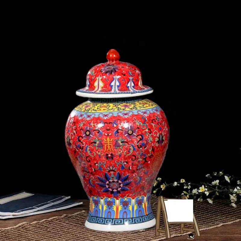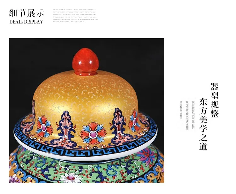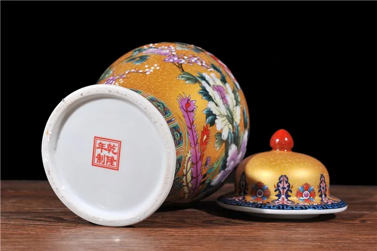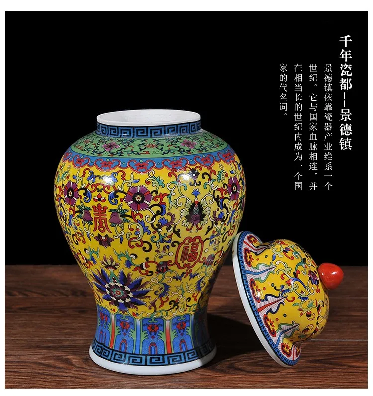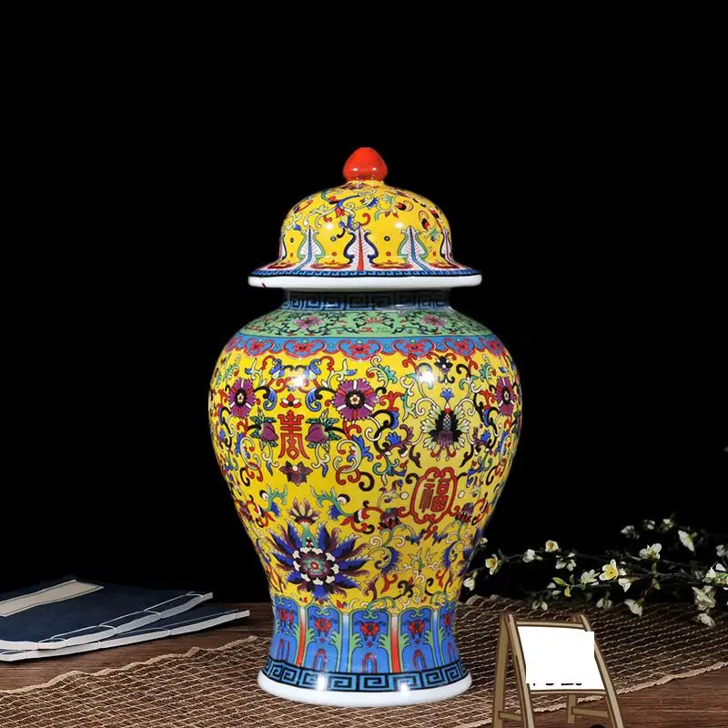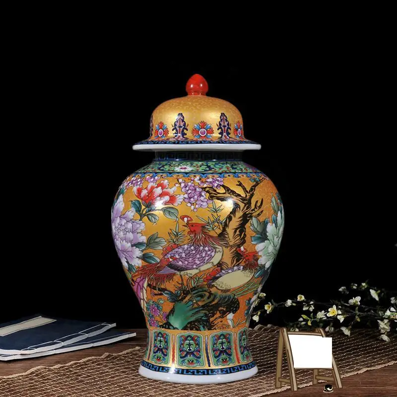 Viene venduto un vaso ceramico nello stile di porcellana di rosa famili. Questo barattolo allo zenzero viene fornito con un coperchio ed è adatto alla decorazione del soggiorno. È dotato di una lampada gialla ed è progettato come un barattolo di tempio in ceramica.