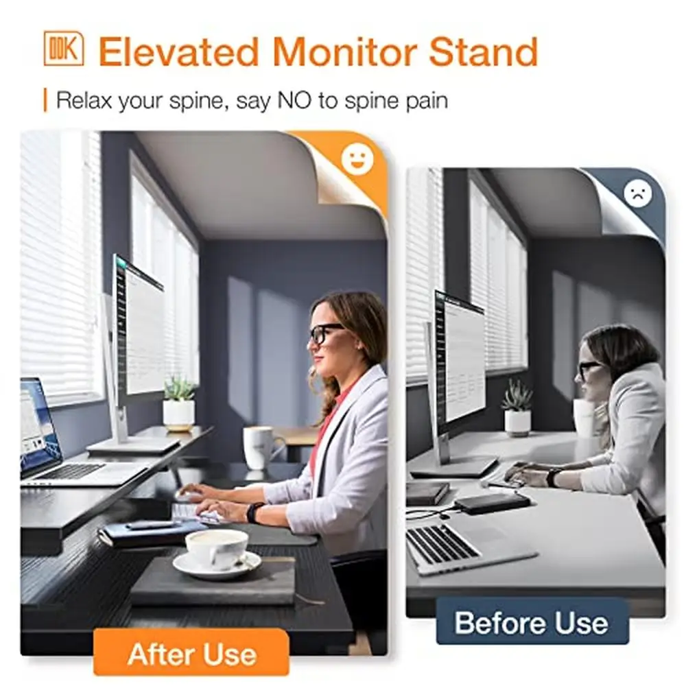 This desk with the raised monitor stand allows for a cleaner looking desk top, besides staging the monitors at a comfortable eye level that won’t strain your eyes or neck and can keep your screens at a comfortable height for working. Keeping your neck healthy but giving you a little extra surface storage area at the same time!