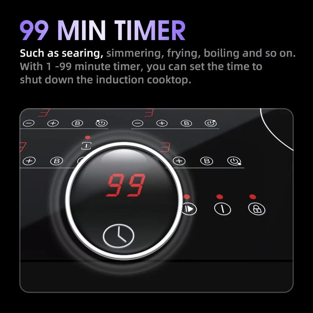 - 【Super Booster and Fast Heat Induction Cooktop】Equipped with 4 Booster burners including 1 bridge elements, the electric cooktop(240V) has 9-level temperature control, total powers up to 7700W. It could meet your diverse cooking needs at the same. Save time and energy.oking needs at the same. Risparmia tempo ed energia.
