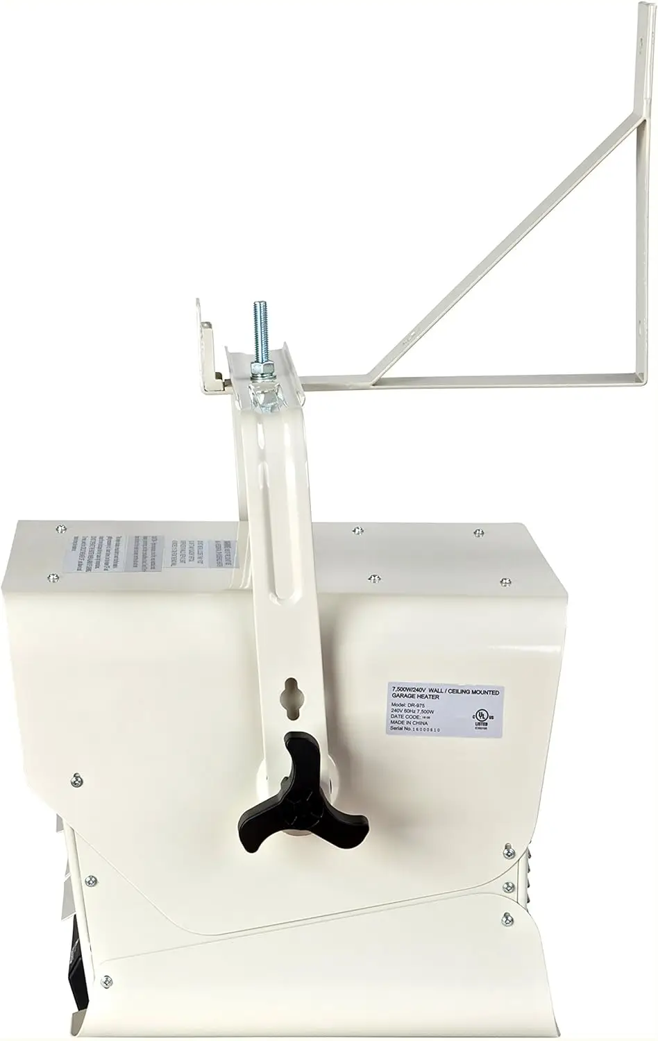 The DR-975 is a 7500-Watt 240-Volt hardwired electric heater designed for use in shops or garages. It can be wall or ceiling mounted and comes with a remote controlled thermostat for convenient temperature adjustments. The heater is gray in color and provides powerful heating for larger spaces. It is easy to install and operate, making it a practical choice for keeping workspaces warm during colder months.