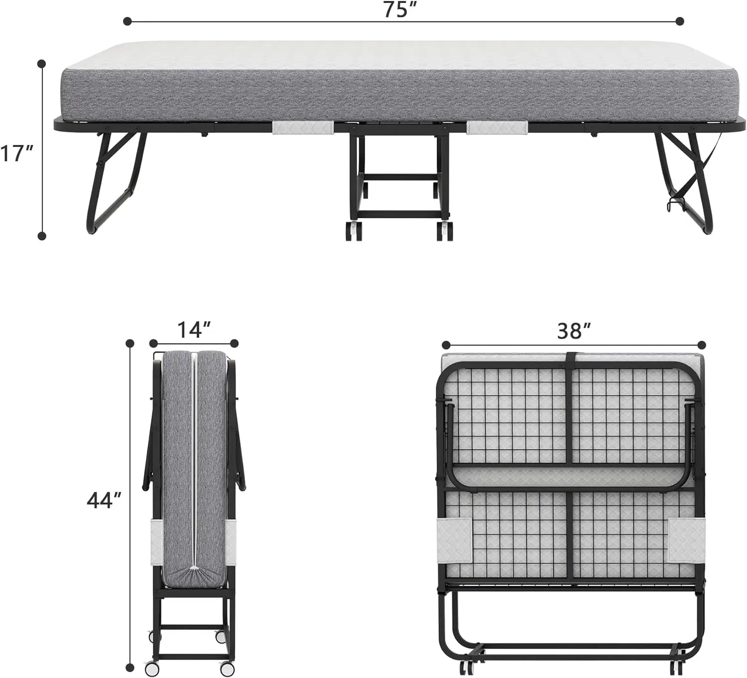 Letto pieghevole con materasso,Letto di rollio portatile per ospite,Foldable Bed with Memory Foam Mattress, Twin Size 75″ X 38″ Fold-up Metal Frame Bed for Adults
