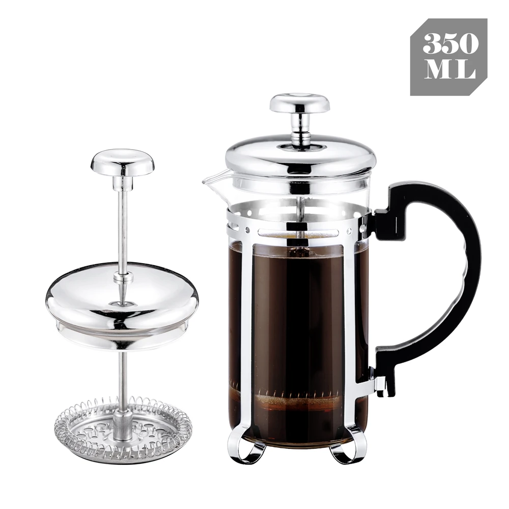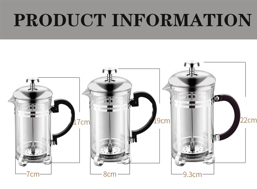 Pressa francese in acciaio inossidabile: Uno dei cardini della nostra pressa francese del nostro caffè è il 304 acciaio inossidabile di grado. Il metallo resistente alla ruggine e alla corrosione costituisce l'alloggiamento della caraffa, filter assembly, coperchio superiore manuale. L'acciaio inossidabile lucido è resistente ma elegante