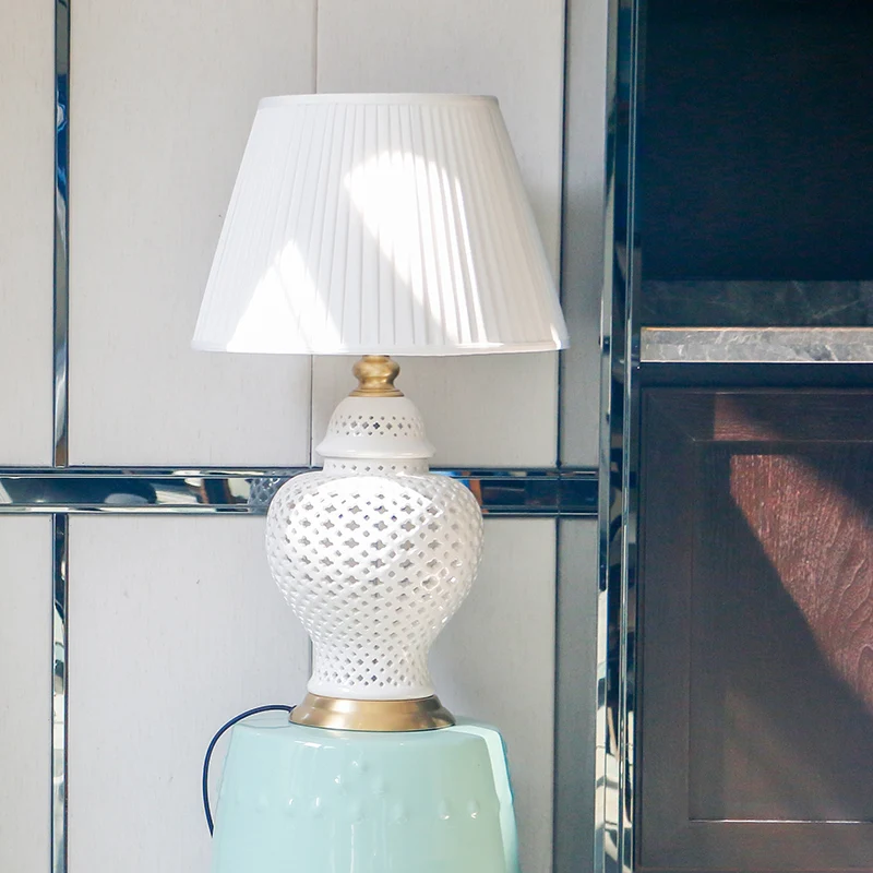 The Hand-Made Modern simple white Hollowed out Ginger Jar Copper Ceramic Table Lamp features a modern design with a white ceramic base that has been hollowed out to create a unique look. The copper accents add a touch of sophistication to the lamp, rendendolo un'aggiunta elegante a qualsiasi stanza. Hand-made and modern, this lamp is a perfect blend of contemporary design and timeless elegance. With its simple yet striking appearance, this lamp is sure to make a statement in any space.