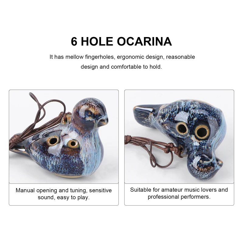 This item is a 6 holes ocarina. It has mellow fingerholes, design ergonomico, reasonable design and comfortable to hold. Its mellow fingerholes, ergonomic design and reasonable design makes it comfortable to hold. It is suitable for amateur music lovers and professional performers.