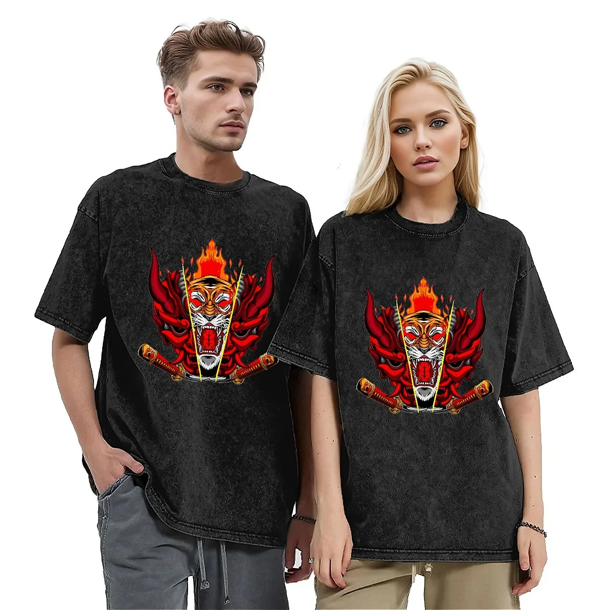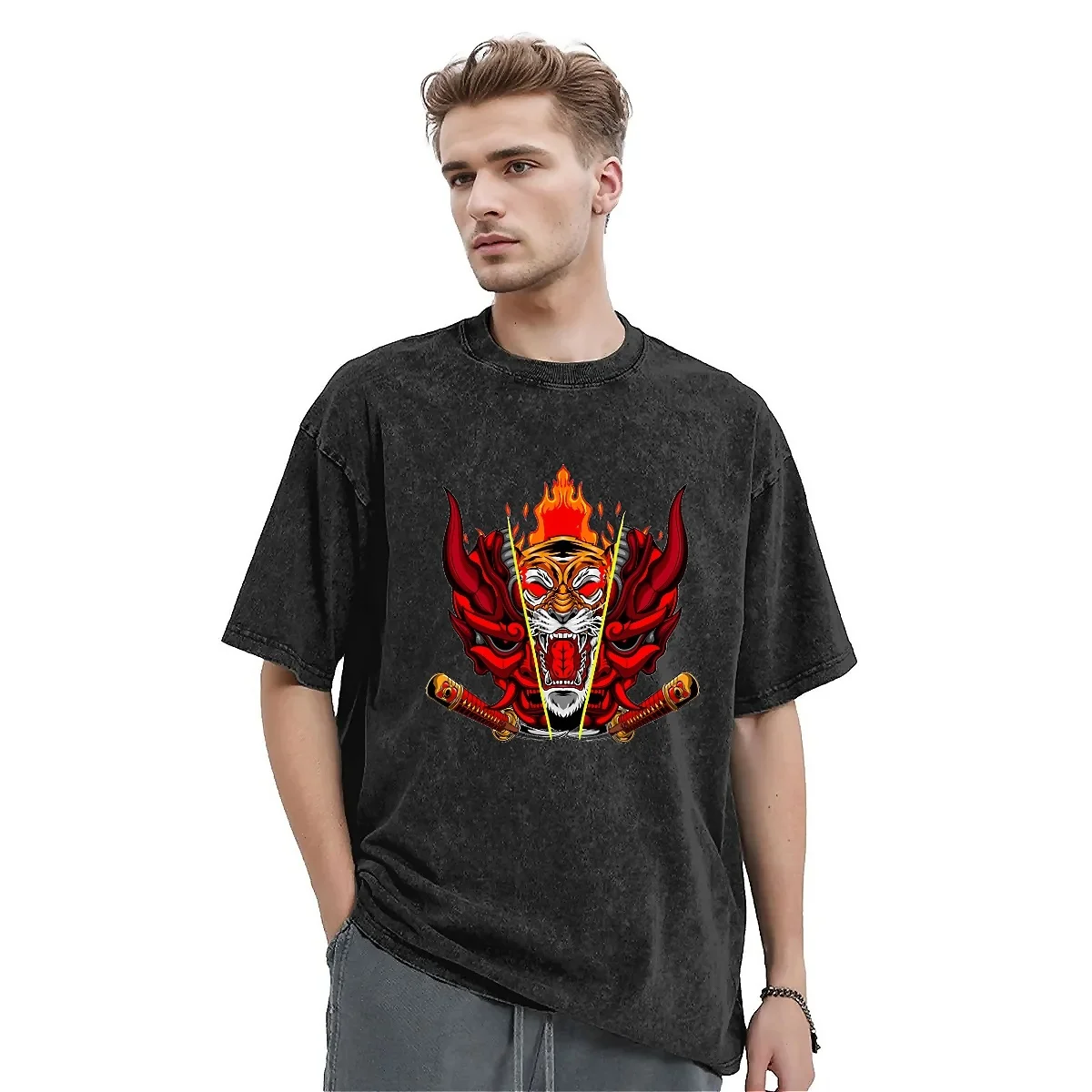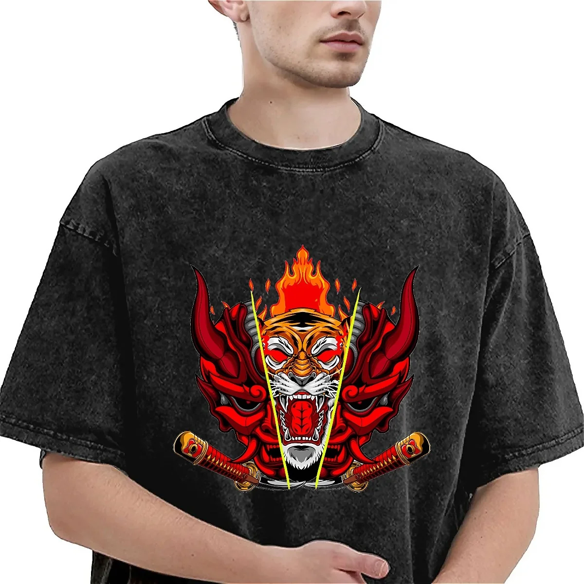 This content describes a kabuki mask washed t-shirt with an abstract tiger design, Y2K inspired. The t-shirt is suitable for both men and women and features a fun casual design. It has an oversized fit and is made for summer wear, with an O neck and hippie-inspired style. The t-shirt is described as a trendy and unique piece of clothing, perfect for those looking to make a statement with their outfit.