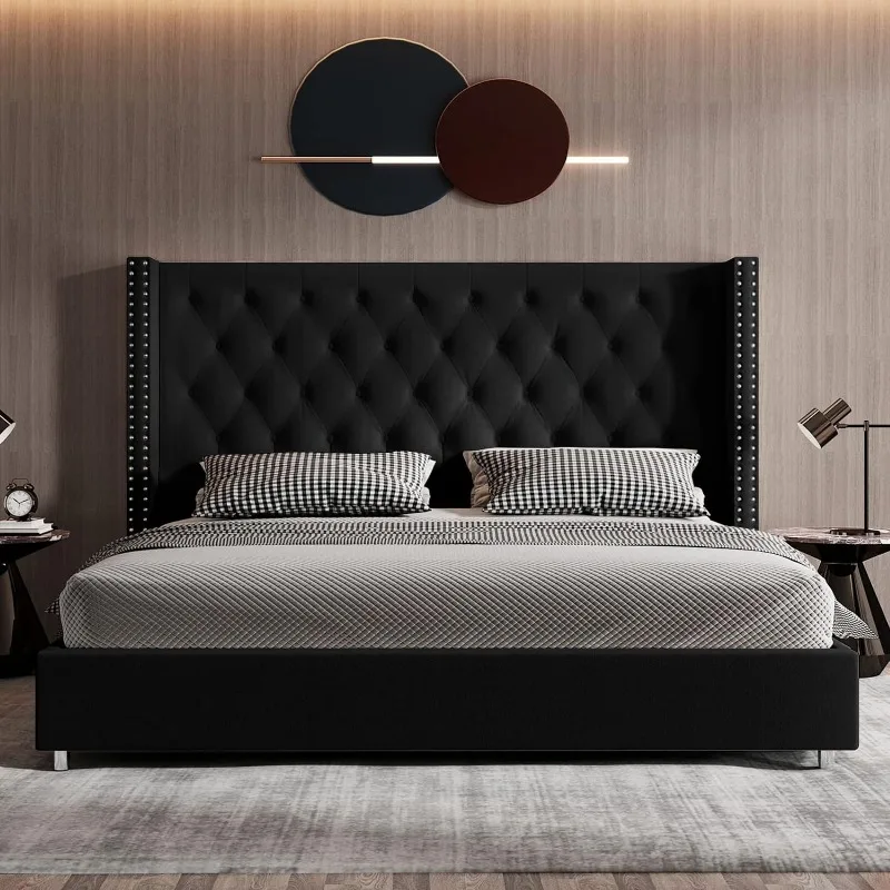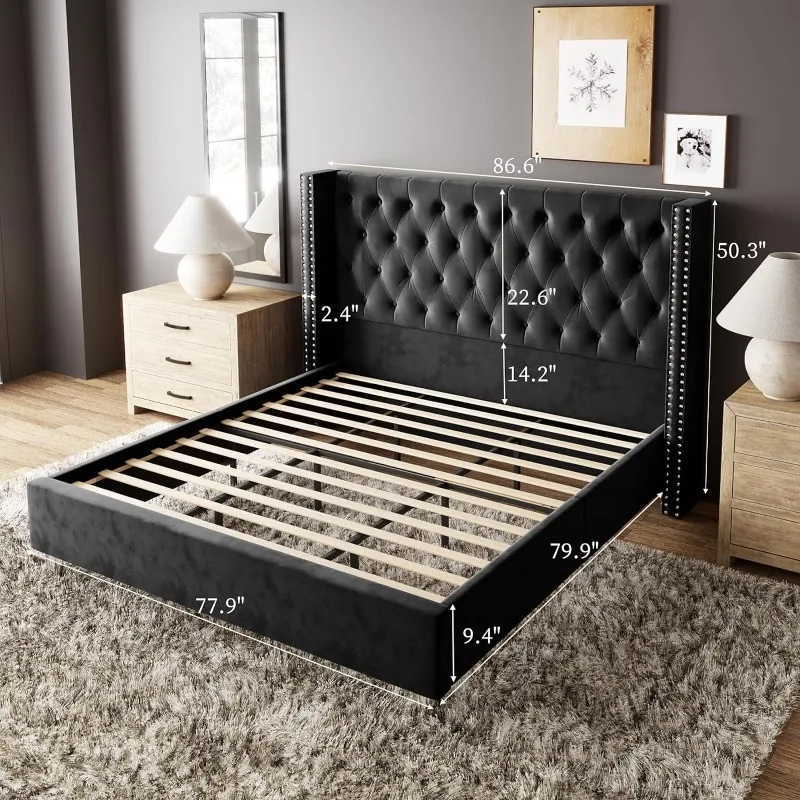 - Extra tall 50.1″ button-tufted,nailhead trim wingback headboard with velvet upholstery makes your bed the centerpiece of bedroom, providing much more comfortable support.
