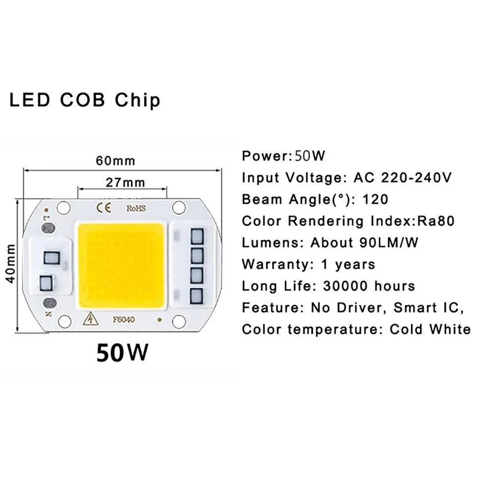 This is a LED COB lamp bead that is 50W and designed for outdoor use. It operates on AC 220V-240V and has an IP65 rating for water resistance. The lamp bead does not require a separate driver as it features an intelligent IC design. It is suitable for DIY projects to create flood lights or spotlights. This chip light is a reliable and energy-efficient option for outdoor lighting needs, providing bright illumination without the need for a driver.