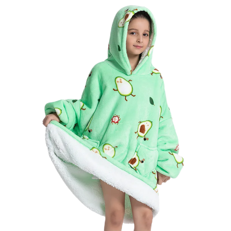 The content describes an oversized wearable blanket in the shape of an avocado hoodie made from flannel sherpa fleece. The blanket is designed to be warm, morbido, and perfect for winter. It is suitable for kids to snuggle in and can be worn as a hoodie sweatshirt. The avocado design adds a fun and cute element to the blanket, rendendolo sia funzionale che elegante.
