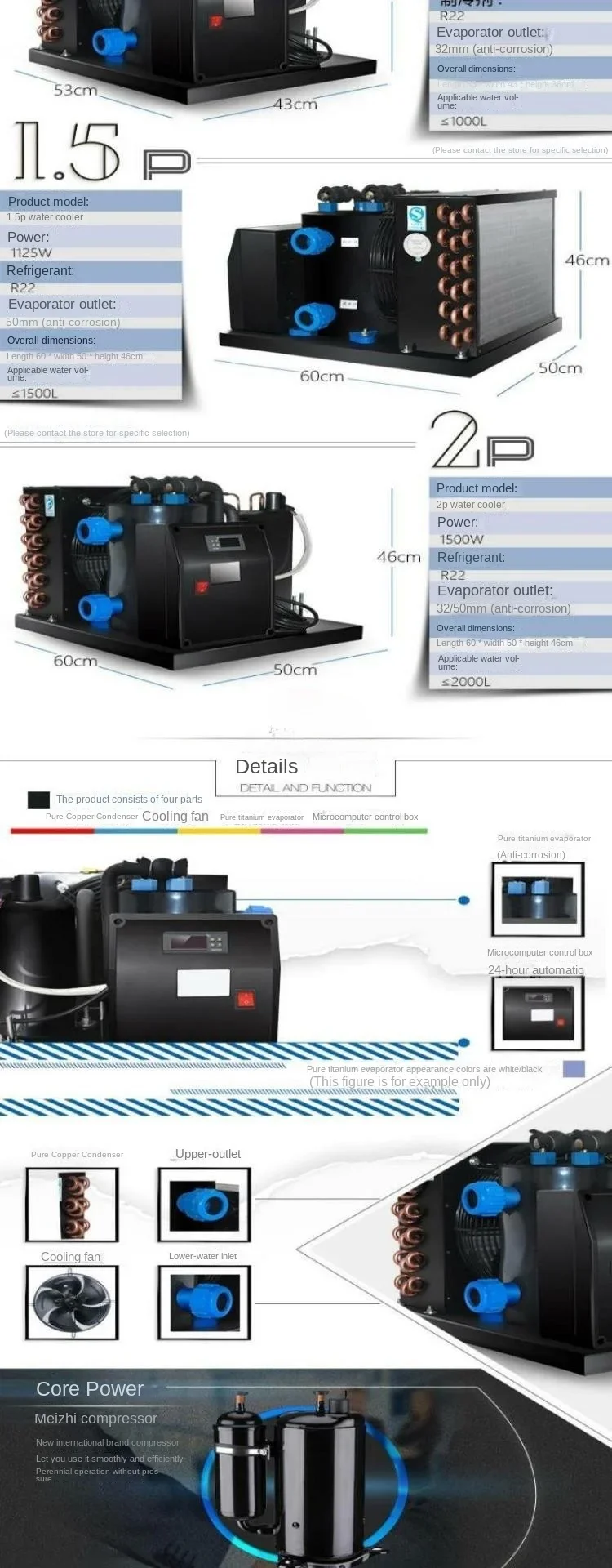 1HP is suitable for water volume below 1000 litri,the power is 800W,Evaporator outlet: 32mm