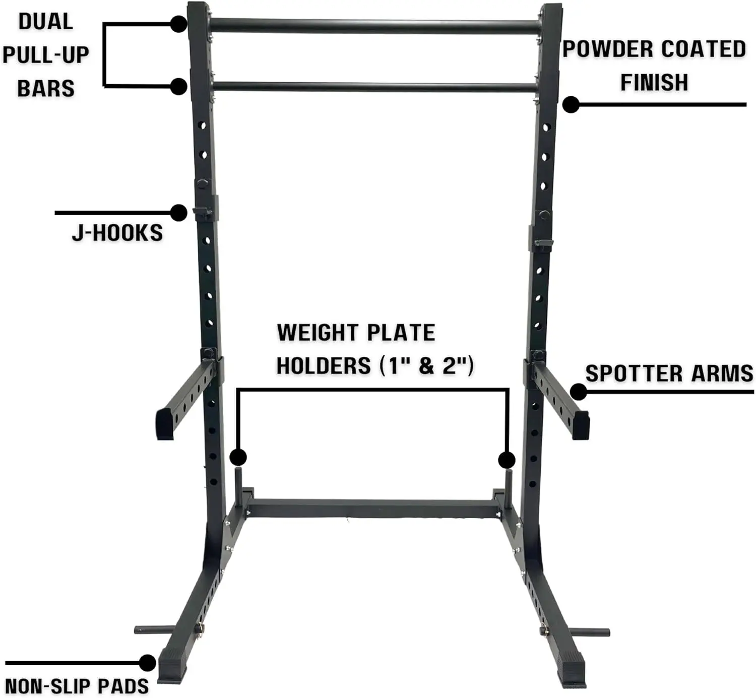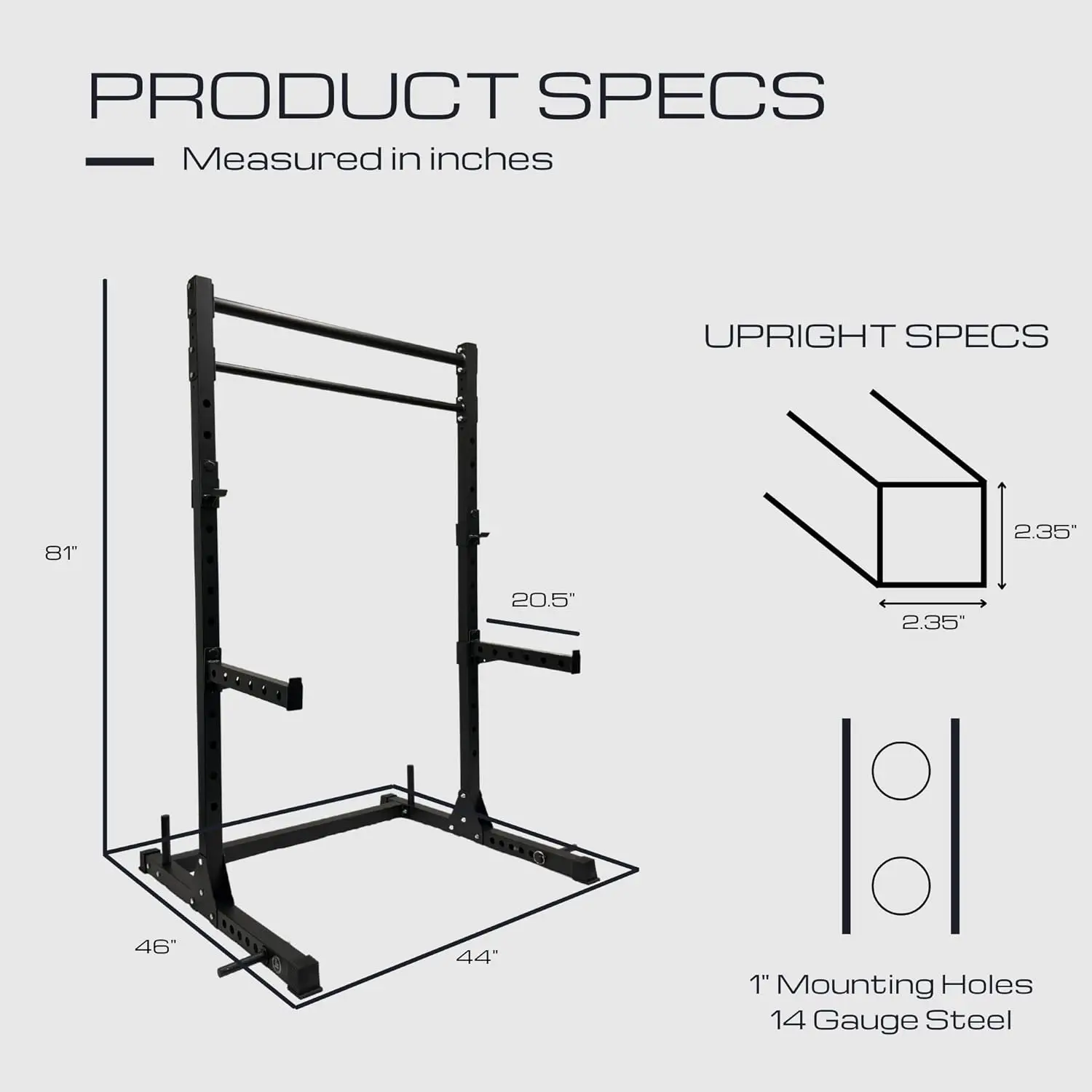 - Specifiche del prodotto – Overall Dimensions 49.6″ X 46″ x 80.5″, J Hooks 5.6″ x2,75″ X 5.9″, Pull up bar 43.75″ x 1″ diameter and 2″ diametro. Plate Holders 19″ x 2.25″ x11,6″, Resistance Band Pegs 10.25″ x 1″ diametro. Capacità di peso 800 libbre.