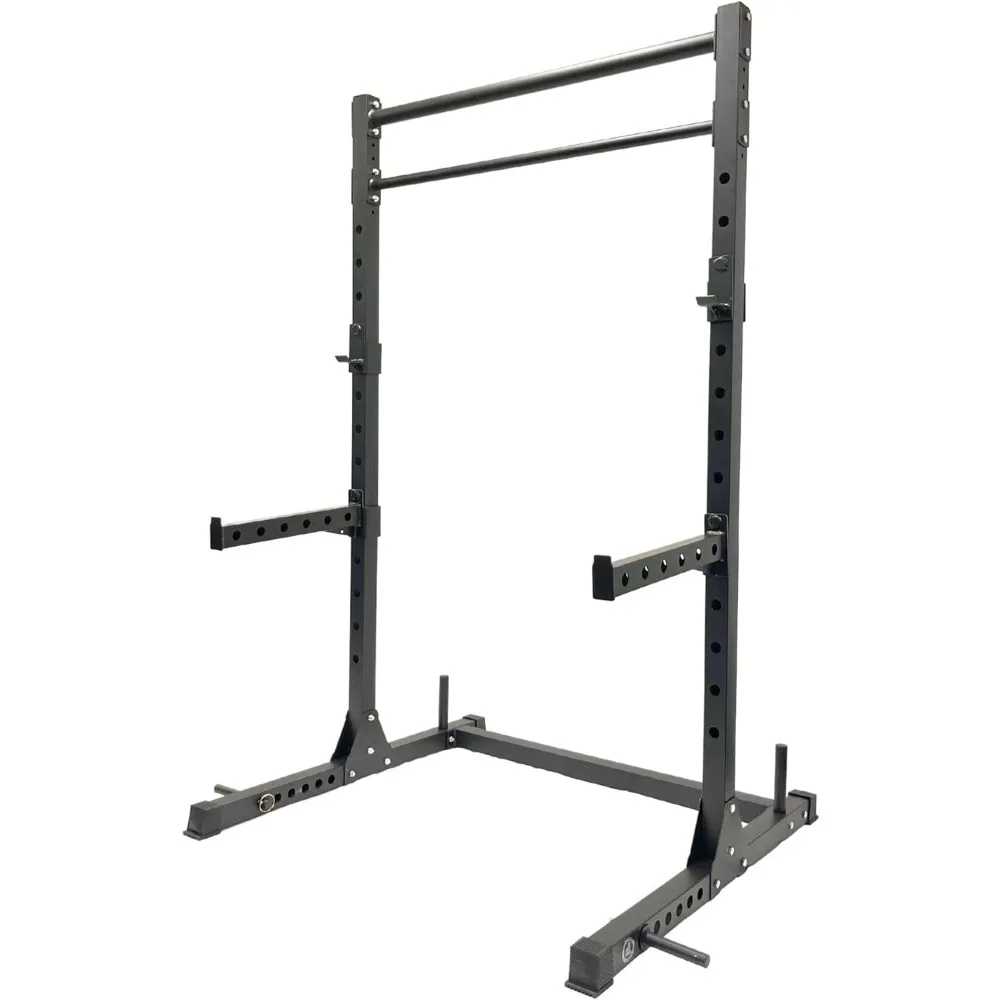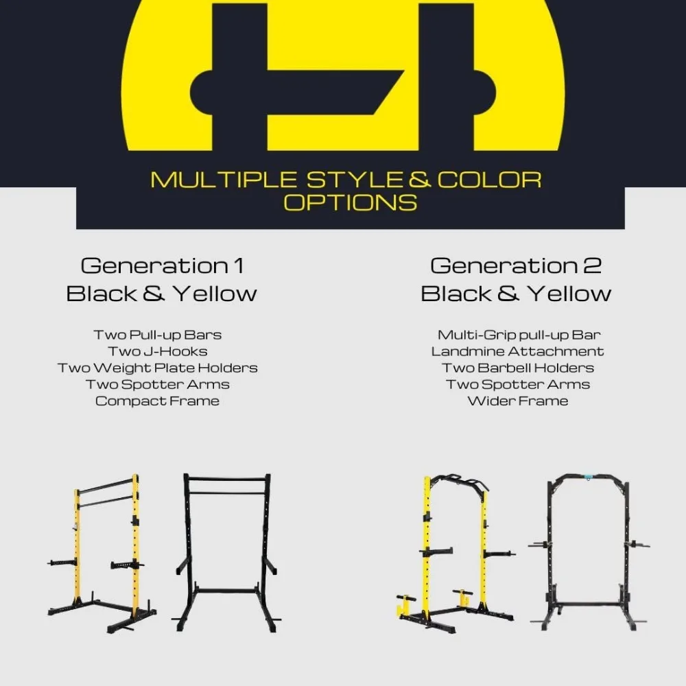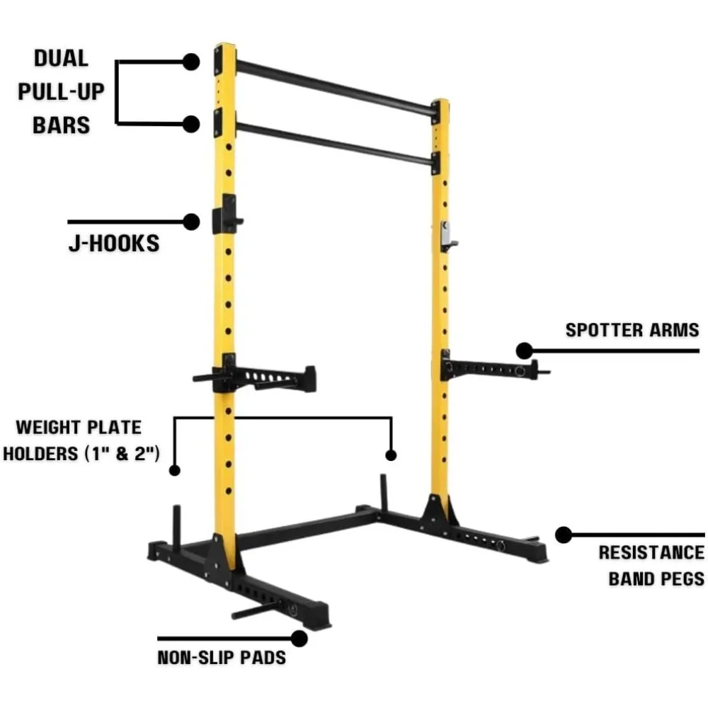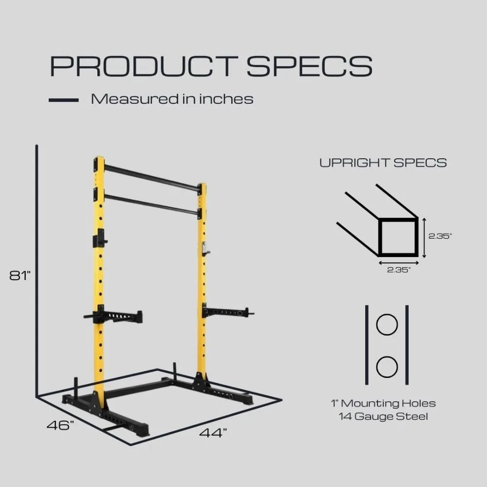 - Specifiche del prodotto – Overall Dimensions 49.6″ X 46″ x 80.5″, J Hooks 5.6″ x2,75″ X 5.9″, Pull up bar 43.75″ x 1″ diameter and 2″ diametro. Plate Holders 19″ x 2.25″ x11,6″, Resistance Band Pegs 10.25″ x 1″ diametro. Capacità di peso 800 libbre.