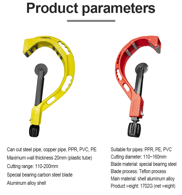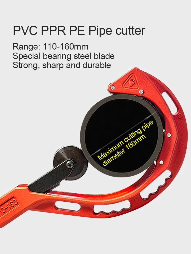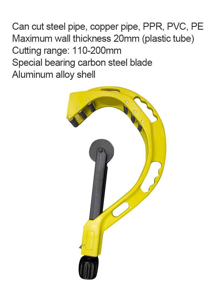 Introducing the Roller Type Stainless Steel Tube Cutter Metal Scissor, designed for precision cutting of PVC and PP pipes with diameters ranging from 110mm to 200mm. This durable and efficient tool is constructed with high-quality stainless steel materials to ensure long-lasting performance and smooth cutting action.