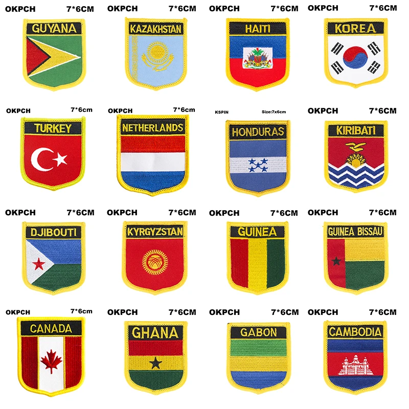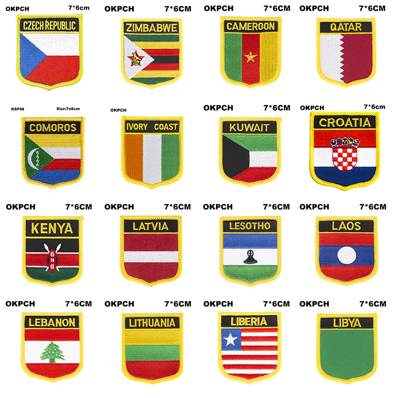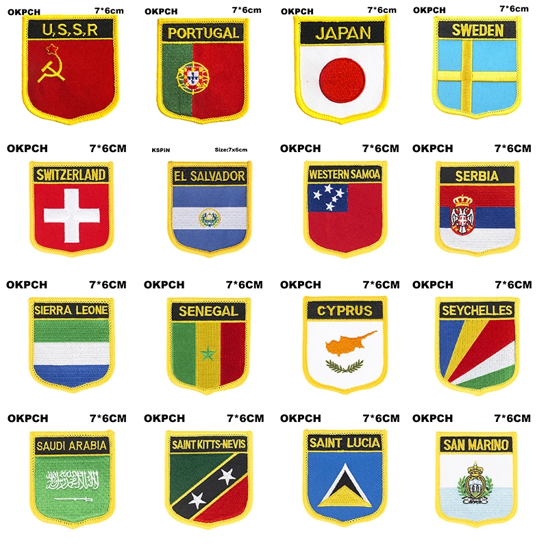 Flag patches in shield shape are available for various countries including the USSR, Portogallo, Svezia, Svizzera, El Salvador, Samoa, Serbia, Sierra Leone, Senegal, and Cyprus. These patches are typically worn on uniforms or clothing to represent national pride or affiliation. Each patch features the flag of the respective country in a shield-shaped design. These patches are popular among collectors, military personnel, and individuals who want to showcase their heritage or support for a particular country. Displaying these patches can be a unique way to show patriotism and connection to a specific nation.