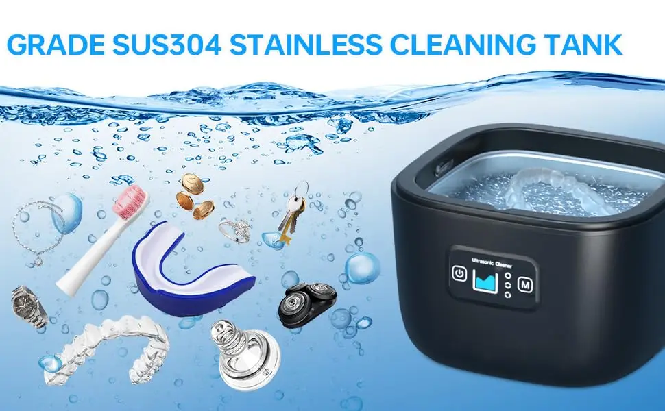 Upgraded internal structure as well as the high-quality ABS material shell and four anti-slip rubber feet, the ultrasonic cleaner operates more quietly and securely. The built-in SUS304 stainless steel cleaning tank durability and ease of cleaning, effectively preventing corrosion from cleaning tablets, agents, o altri liquidi.