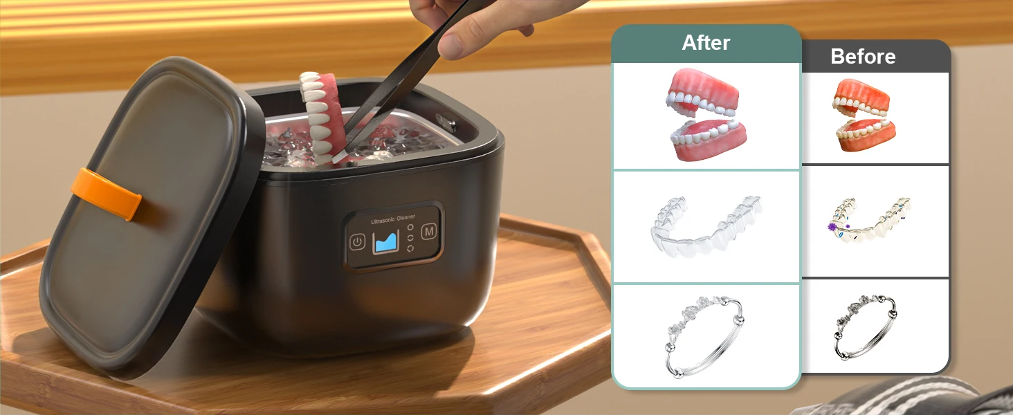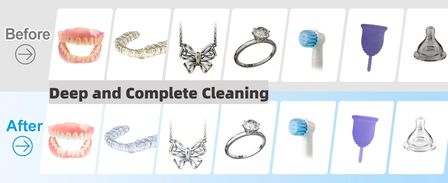 Everlast retainer cleaner utilizes 42-45kHz ultrasonic waves to penetrate crevices and cavities, effectively removing particles from dentures, retainers, braces, teeth aligners, whitening trays, mouth guards, toothbrush heads, and even jewelry. Combined with UV, it leaves items shining and hygienic.