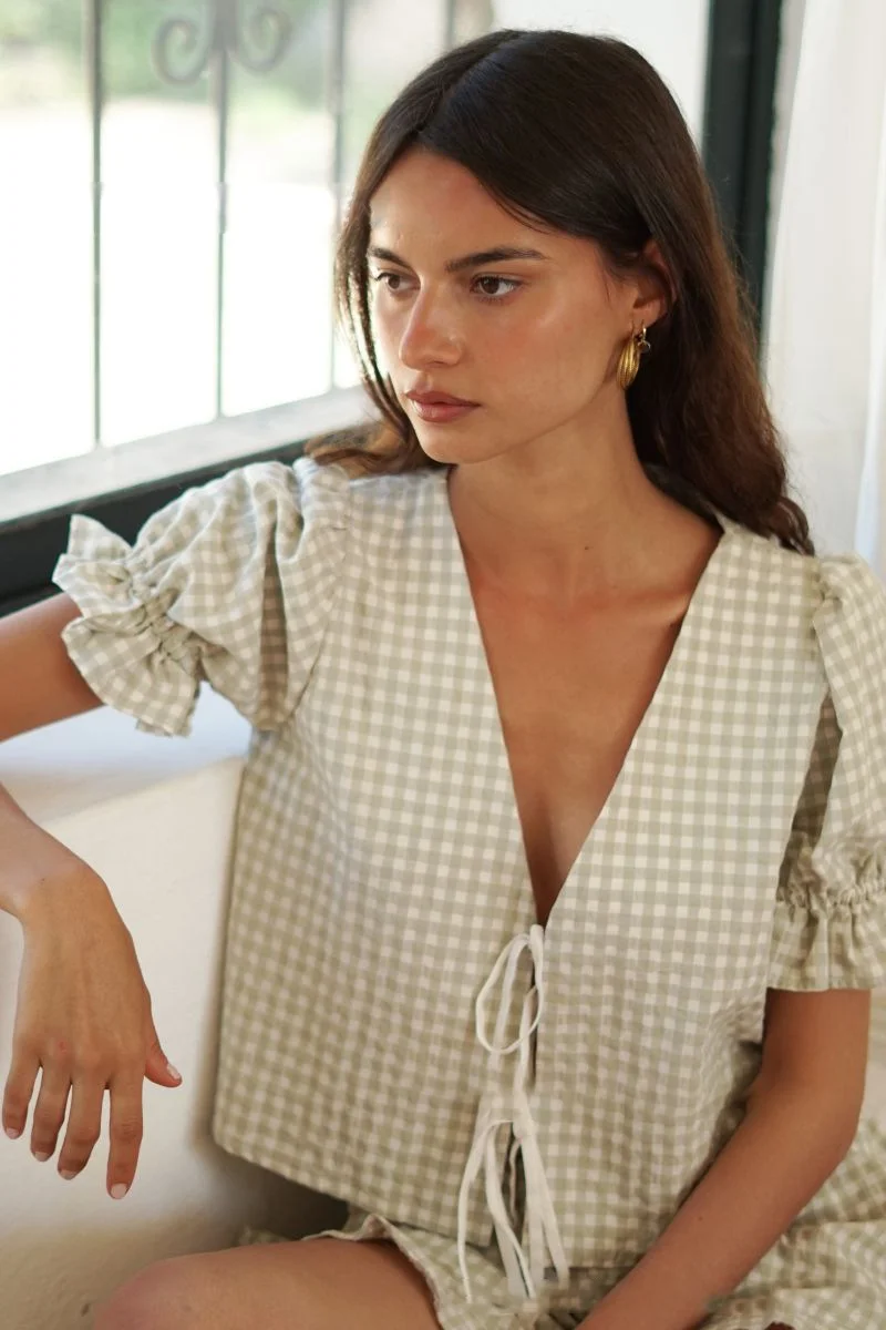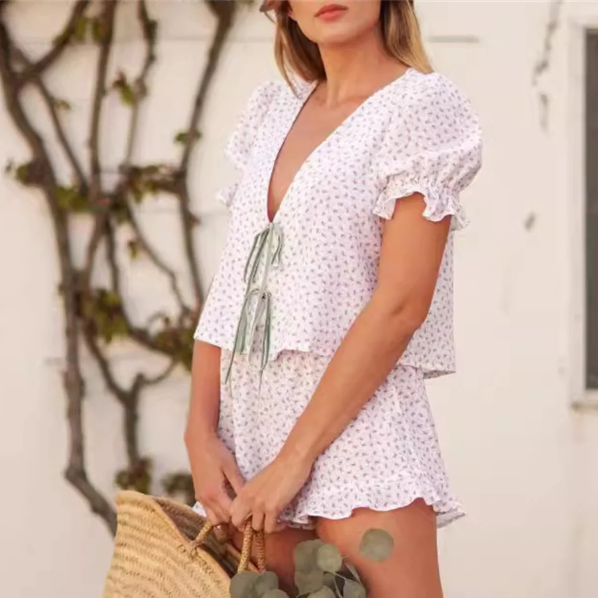 This content describes a two-piece set for women’s fashion, featuring a solid color, loose fit, V-neck top and shorts with a lace-up design. The set is perfect for summer, with a sexy and casual beach vibe. The high-waisted shorts are striped for added style. The outfit is trendy and comfortable, suitable for various occasions during the summer of 2024.