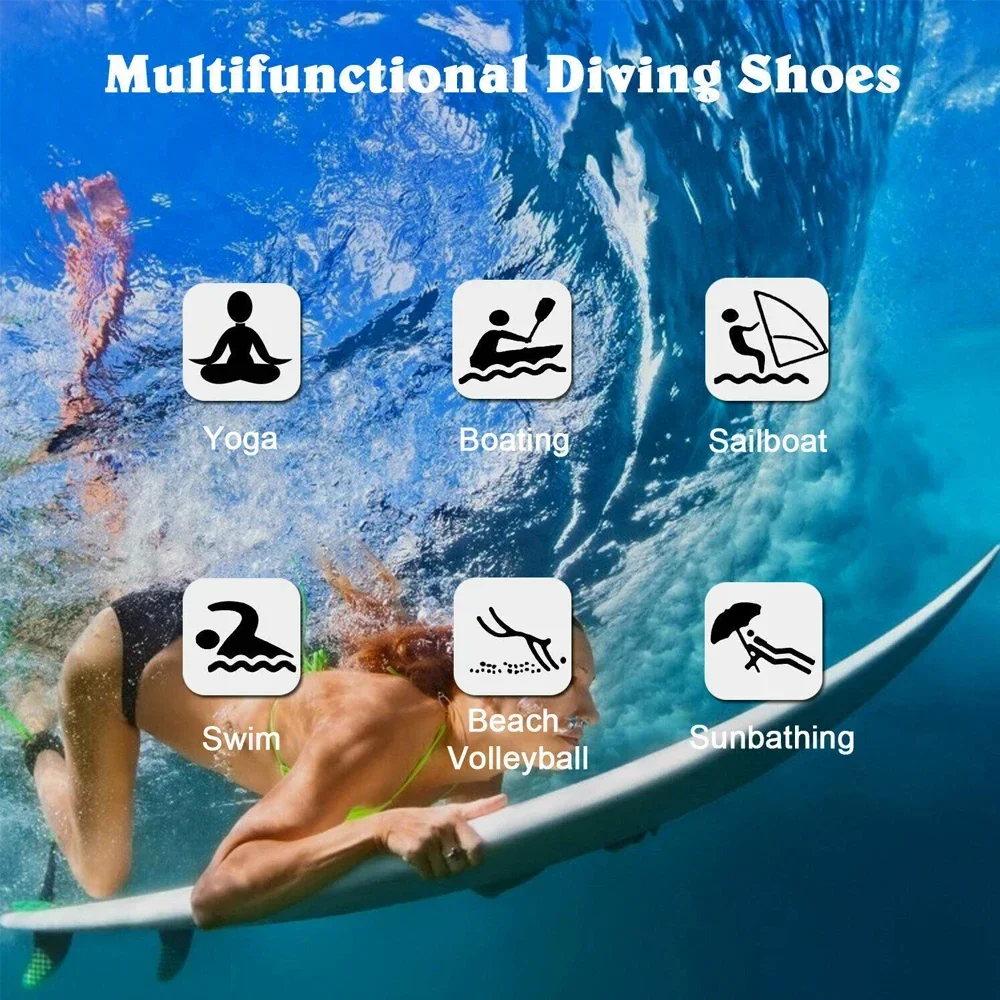 The content describes a pair of water shoes or aqua socks that are quick-drying, non-slip, and designed for barefoot use. These shoes are suitable for activities like swimming, water sports, and hiking in wet environments. They provide protection and support while maintaining a lightweight and comfortable fit. The shoes are made with durable materials that are designed to withstand water and rough terrain. They are ideal for anyone looking for a practical and versatile shoe option for various outdoor activities that involve water or wet conditions.