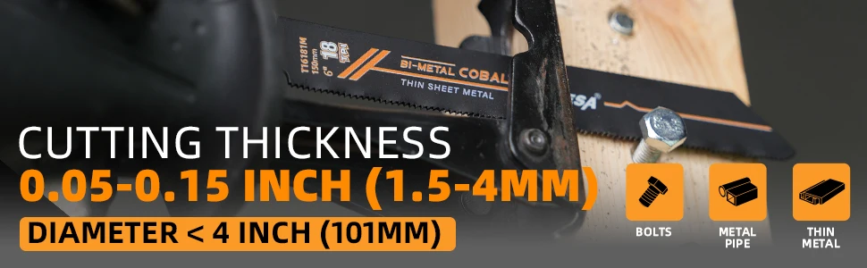 【Excellent Metal Cutting Skills】– Bi-metal M42 sawzall blades metal cutting with sturdy cobalt edge provide effortless cutting into sheet metal, metal pipe, profile and bolts. M42 Bi-Metal Sawzall Blades cut through thin to medium sheet metals 0.05-0.15 inch (1.5-4mm), solid pipes/profiles diameter < 4 inch (101mm) or < 7 inch (175mm)