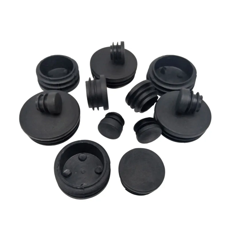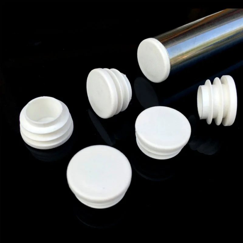 This product is a set of 10 white/black plastic round caps for the feet of tables and chairs. They are used to cover holes in tubing or pipe ends, acting as a stopper. The caps come in various sizes ranging from 13mm to 76mm. They are designed to prevent damage to floors and provide a finished look to furniture.