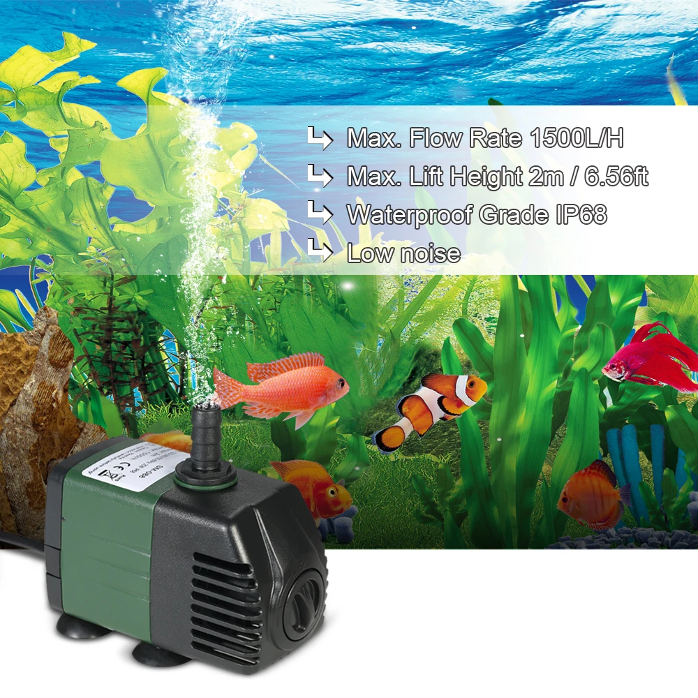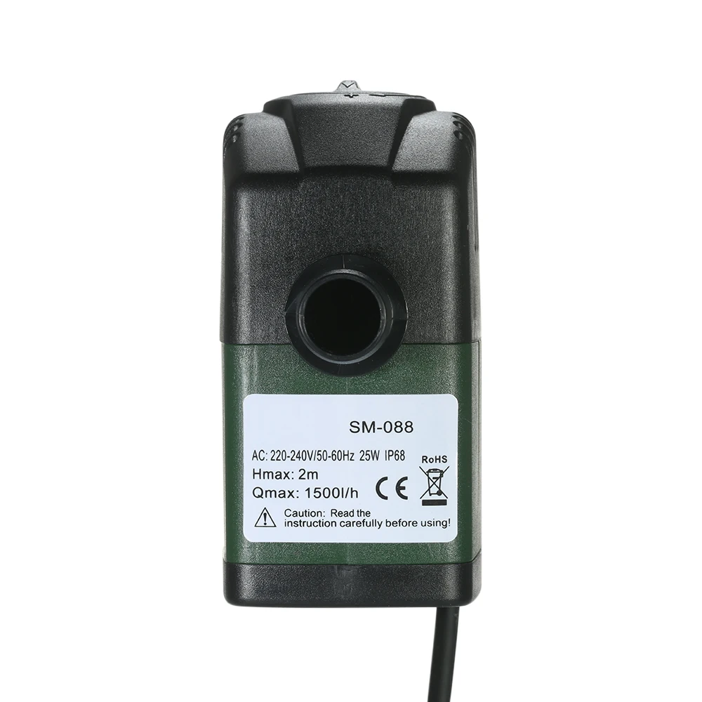 Max. flow rate: 1500L/H, H-Max.(lift height): 6.56ft(2m), 25W high efficiency motor.