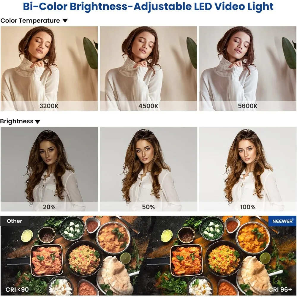 - 【Bi Color Dimmable LED Studio Light】 With 330 warm white and 330 cool white LEDs, this 660 40W LED Video Light features a maximum illuminance of 3300 lux/1m, 3200K-5600K adjustable color temperature, and 0-100% adjustable brightness. The high CRI of 96+ ensures an authentic reproduction of colors. Voltage: DC 12V; Input Voltage: 100V-240V; Battery Output: DC 14.8V. Consistent and flicker free lighting is essential for filmmakers, portraits, product photography, YouTube videos, gaming, and more
