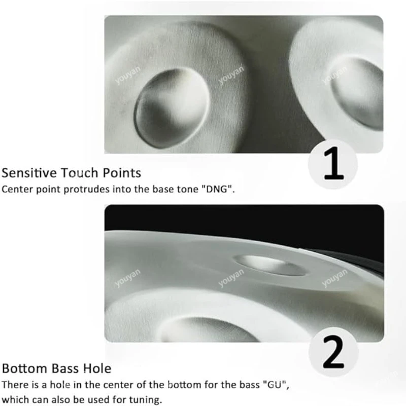 【Handmade craftsmanship】♬: Our handpan drums are all hand-hammered tuned, they will leave slight uneven marks, which are fine handmade traces. The tuner uses countless strokes to make every note accurate and have obvious hammer marks, which is normal.