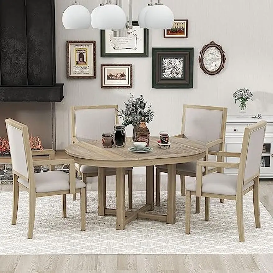 - 5 Piece Dining Table Set: This 5 set of elegant dining table and chairs includes an extendable round table and 4 dining chairs. Two colors can be selected, which can match your decoration style very harmoniously. The log-colored table and chair set creates a simple and warm farmhouse atmosphere. The perfect combination of brown and white creates a retro charm. 5 piece kitchen table set is perfect for dinner or family gatherings in the kitchen or living room.