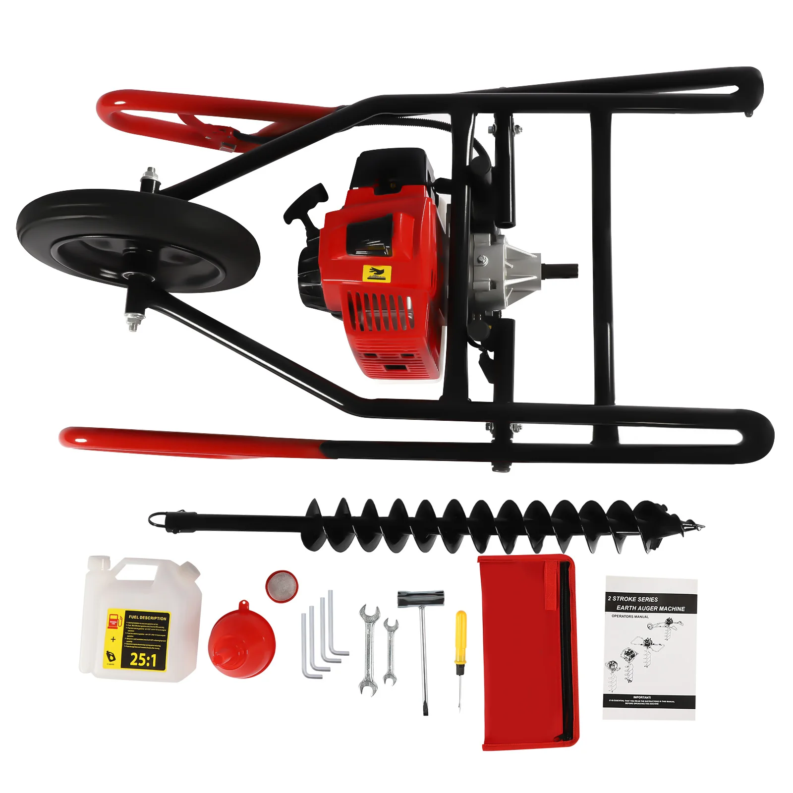 Complete Kit: This product is complete in the package, including a hole digger, a fuel mixing bottle, a funnel, a drill bit, a tool bag, an English manual, and other tools. The tool bag allows you to put small accessories in it to avoid losing them, which is practical.