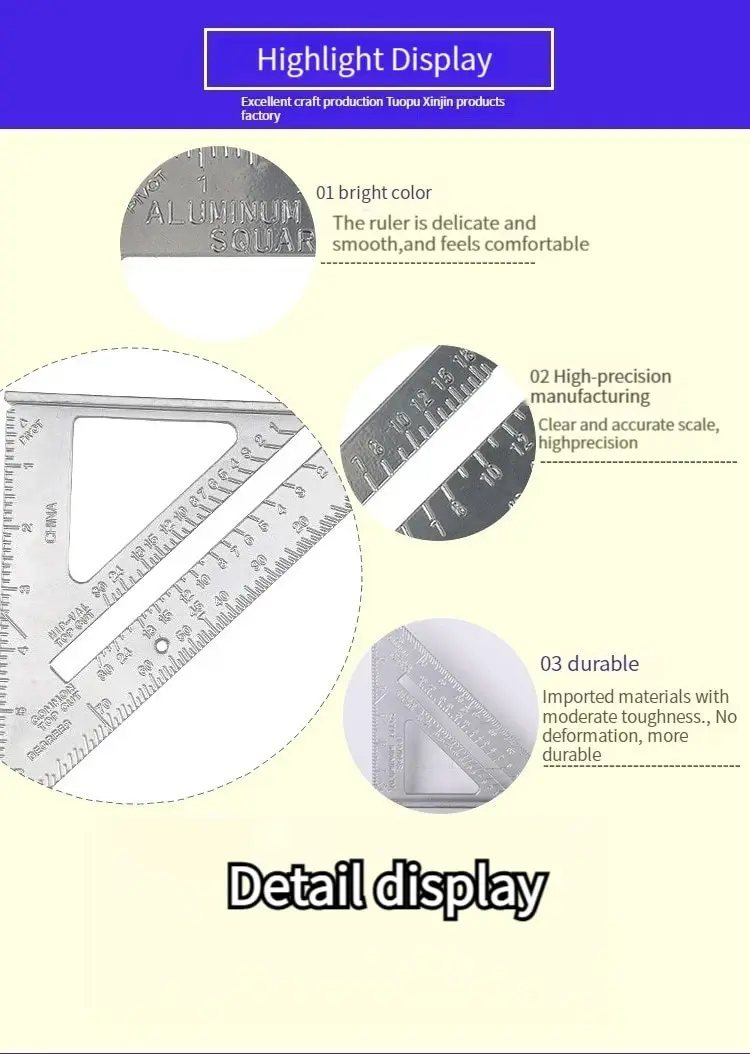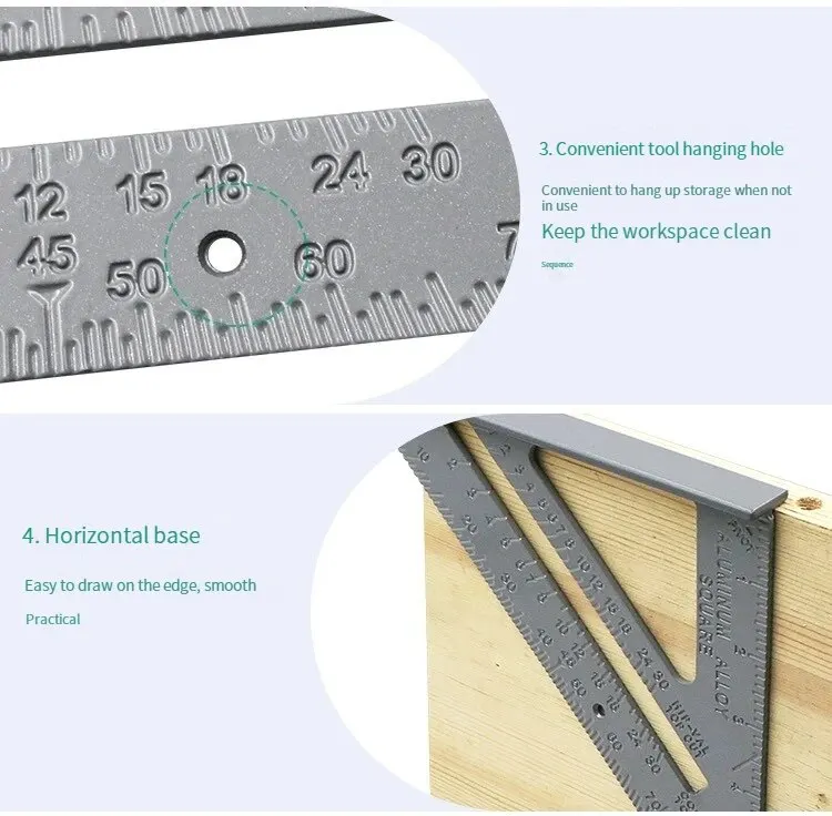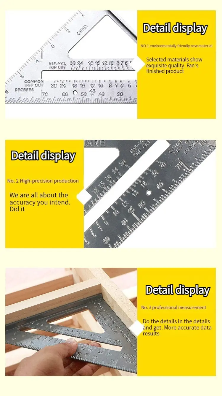 The triangle shape of the ruler allows for a variety of uses, including measuring angles, sides, and heights, making it a versatile tool for any woodworking project.