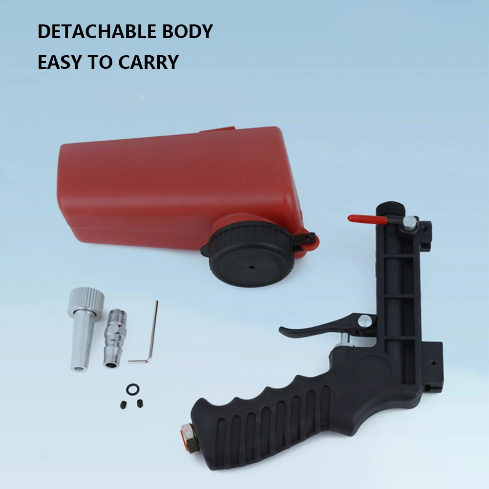 90psi Pneumatic Sand Blasting Machine Portable Adjustable Portable Gravity Sandblasting Gun Handheld Pneumatic Sandblaster Spray Gun Non-Slip Handle for Removal Paint Rust Corrosion Scale Feature: 1. Premium Materials: This portable sandblasting gun features a lightweight and compact all-aluminum body, making it easy to carry and operate manually. It is designed to effectively remove paint, stains, rust, and clean surfaces with ease. 2. High Performance: Built to last, this durable pneumatic sand blasting machine can propel high-speed media particles, rapidly eliminating paint, corrosion, rust, and scale. Experience efficient and thorough surface cleaning without the need for excessive manual labor. 3. Versatile Applications: This portable gravity sandblasting gun is ideal for various metal materials, including edges, surfaces, corners, deburring, and detail spray painting and polishing. Achieve professional results in a wide range of applications, from automotive restoration to industrial projects. 4. Anti-Slip Design: The ergonomic anti-slip handle of air sandblasting gun is designed with user comfort in mind. Featuring an aluminum alloy trigger and a high-hardness steel valve core, this sandblasting gun ensures convenient operation while reducing hand fatigue during prolonged use. 5. Easy to Use and Maintain: This pneumatic sandblaster spray gun is designed for user-friendly operation. Its lightweight and compact design allow for easy handling and storage. Additionally, the gun requires minimal maintenance, ensuring hassle-free usage and long-lasting performance.