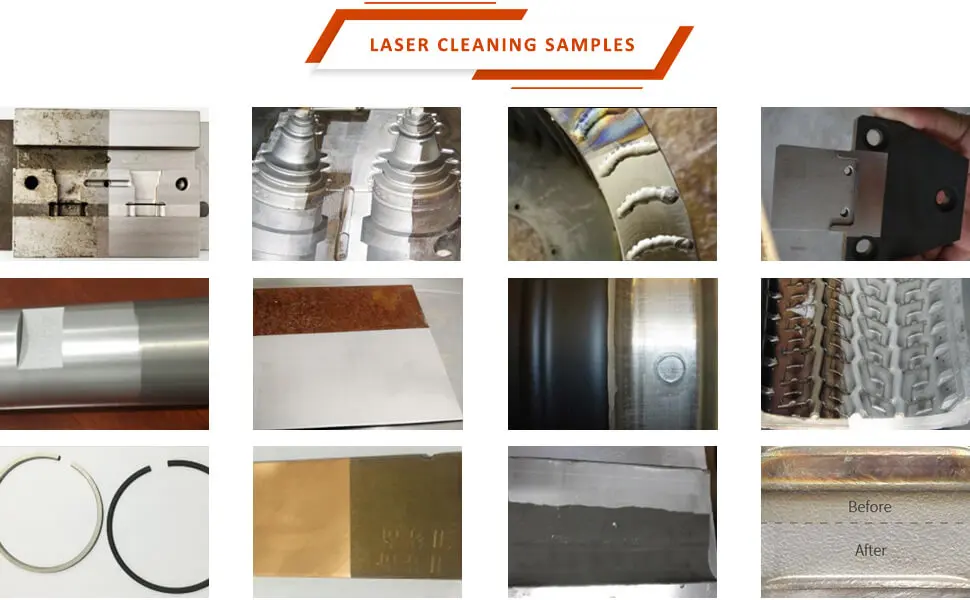 The fiber laser cleaning machinehas a good cleaning effect on iron, carbon steel plate, stainless steel plate, mold steel gear, aluminum plate, paint layer, and other materials. It can be used to clean the oxide layer, surface paint removal treatment, clean surface oil, stains, and dirt, clean rubber mold residues, and meet the equipment cleaning requirements in the fields of the shipbuilding industry, auto parts, rubber molds, machine tools, and environmental protection industries.