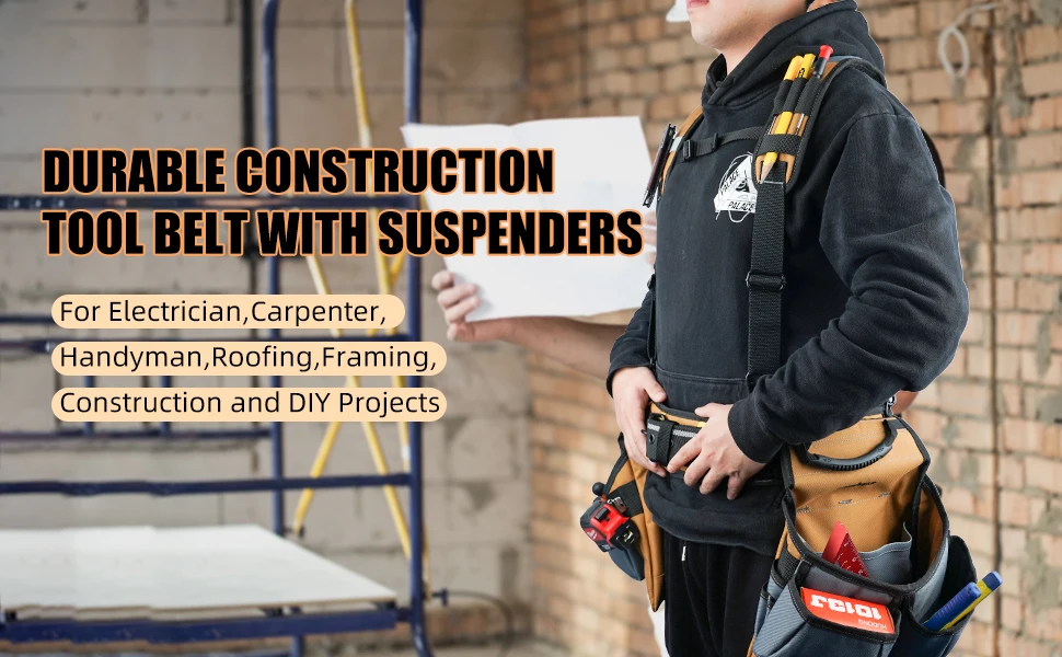 【Durable & Construction】This tool belt with suspenders is made of high-quality tear-resistant material. Stitches and reinforcement at each point of action ensure safe and reliable work.