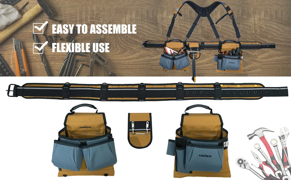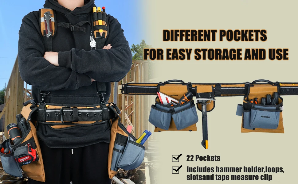 【Function】When you are carrying heavy tools on your waist. This is when you need a frame tool belt that can help you distribute the weight evenly to reduce stress. Fully detachable tool rig, including tool belt, 2 large tool pouches, hammer holder, and belt. Multi-pocket design holds all the tools you need. Combined carpenter tool belt set is easy to add and remove.