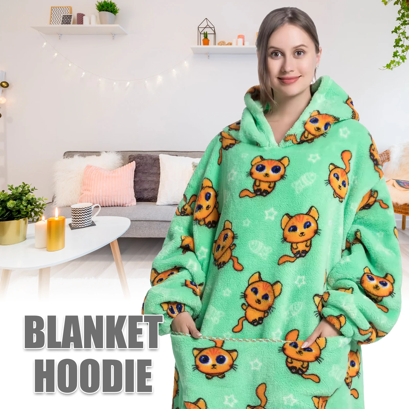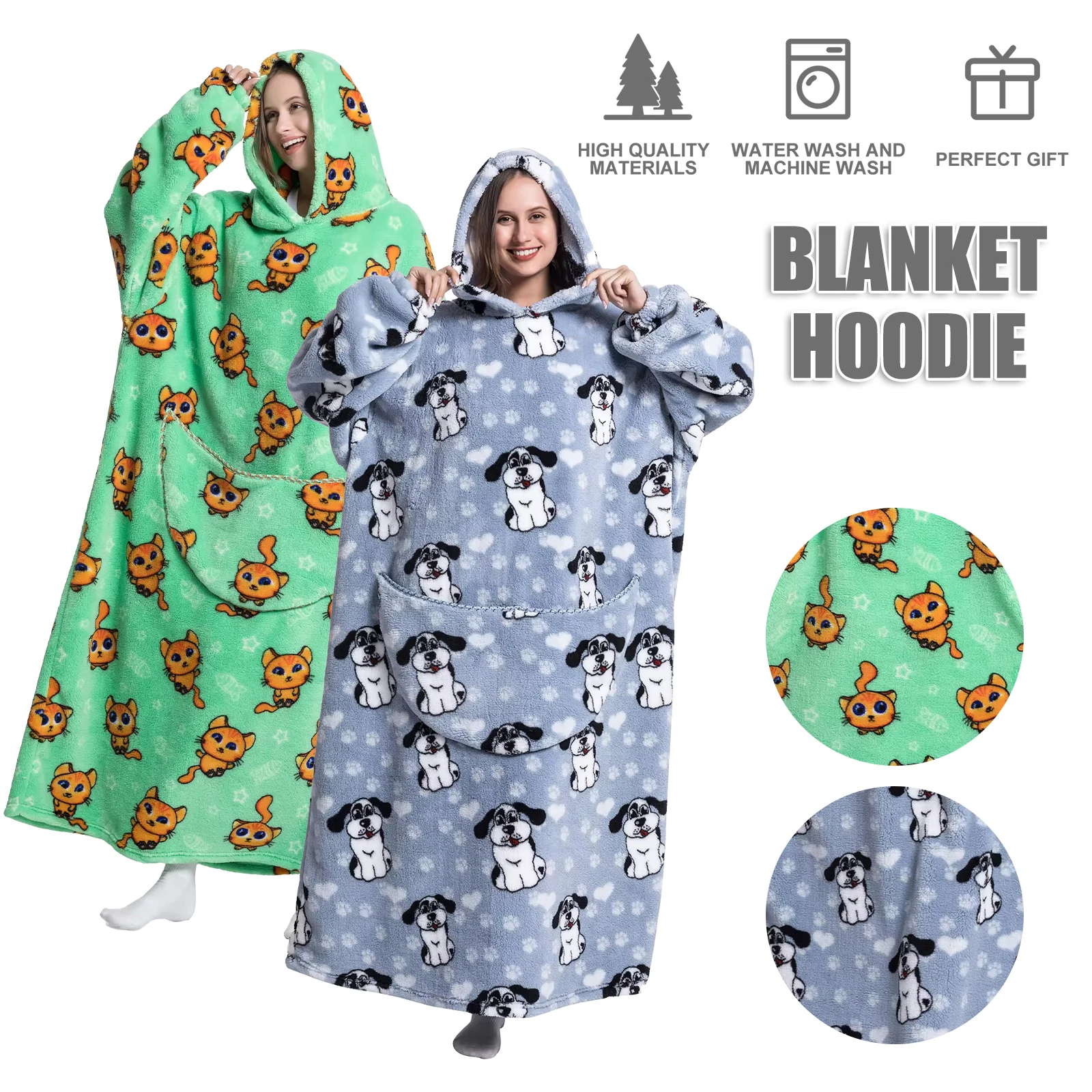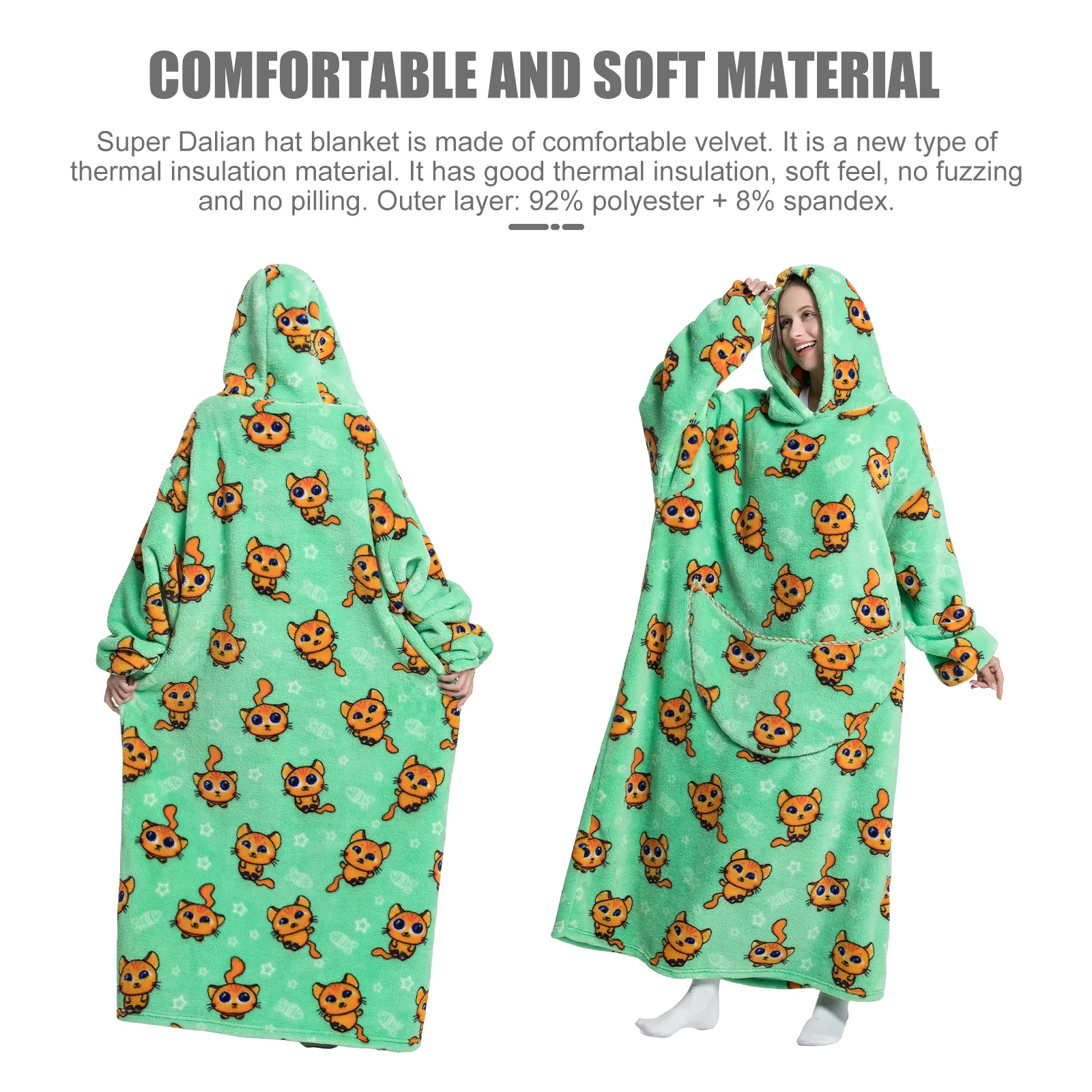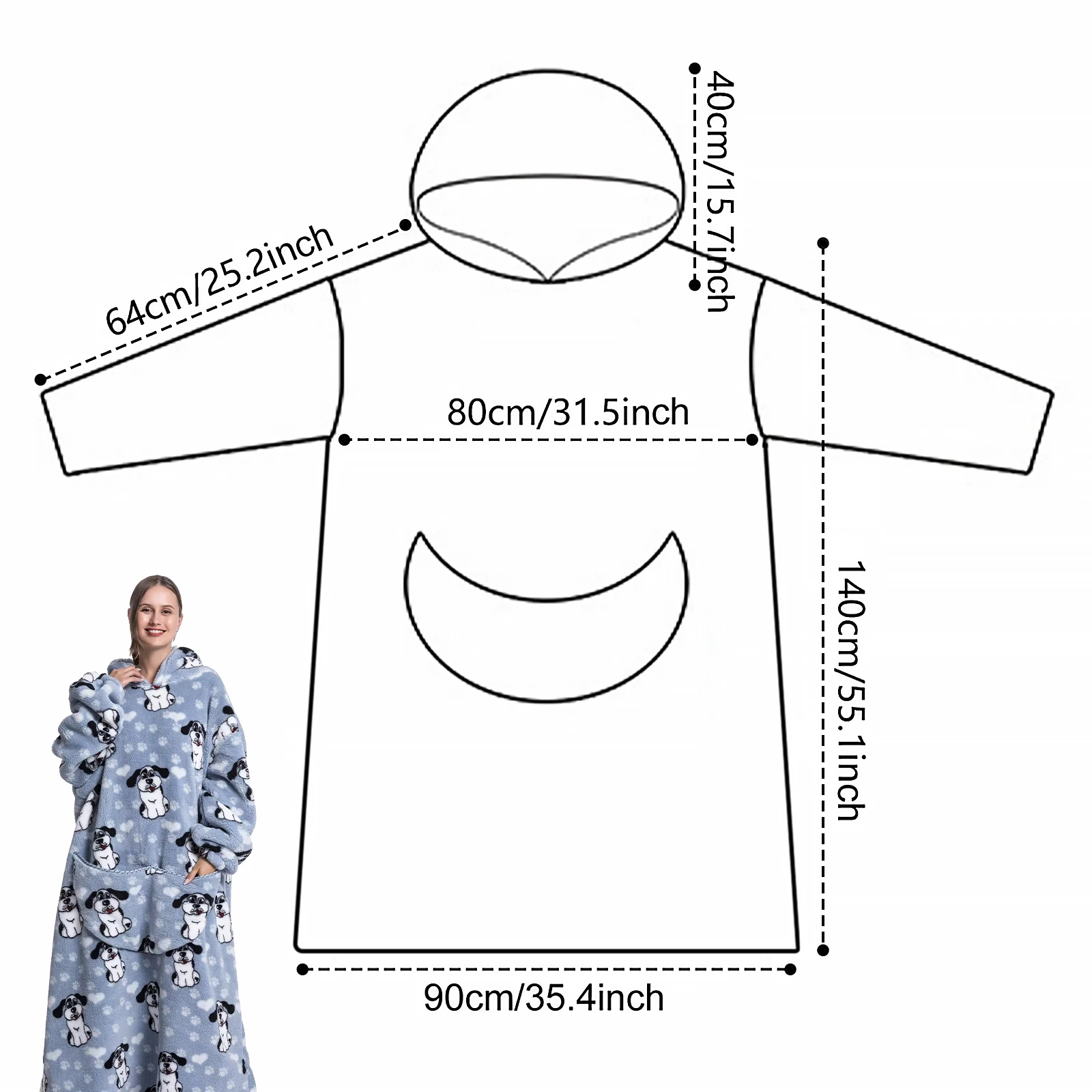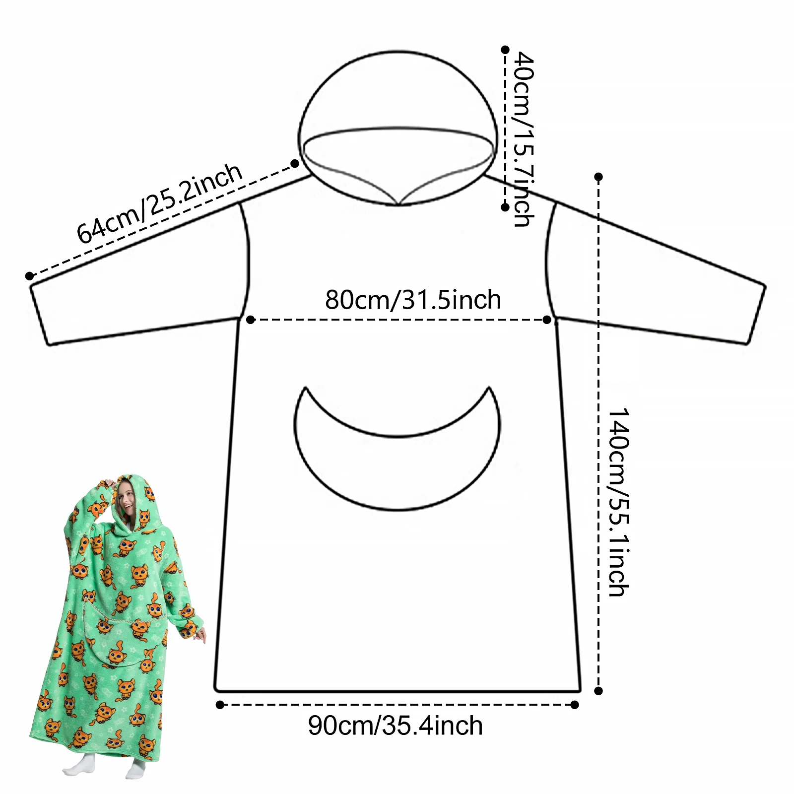 Stay cozy and warm with this oversized wearable hooded blanket sweatshirt, featuring cute cartoon prints. Perfect for men and women, this hooded blanket is great for lounging at home or staying warm on the go. The convenient dropshipping option makes it easy to order and receive your blanket hoodie without any hassle. This unique and practical item combines the comfort of a blanket with the style of a hoodie, making it a must-have for anyone looking to stay warm and stylish during colder months.