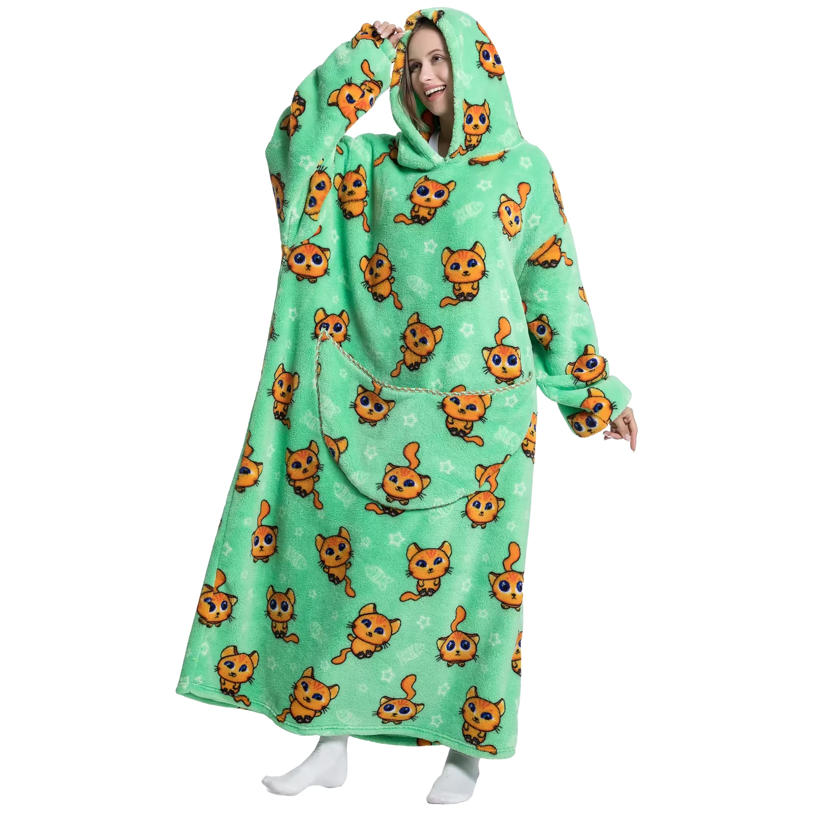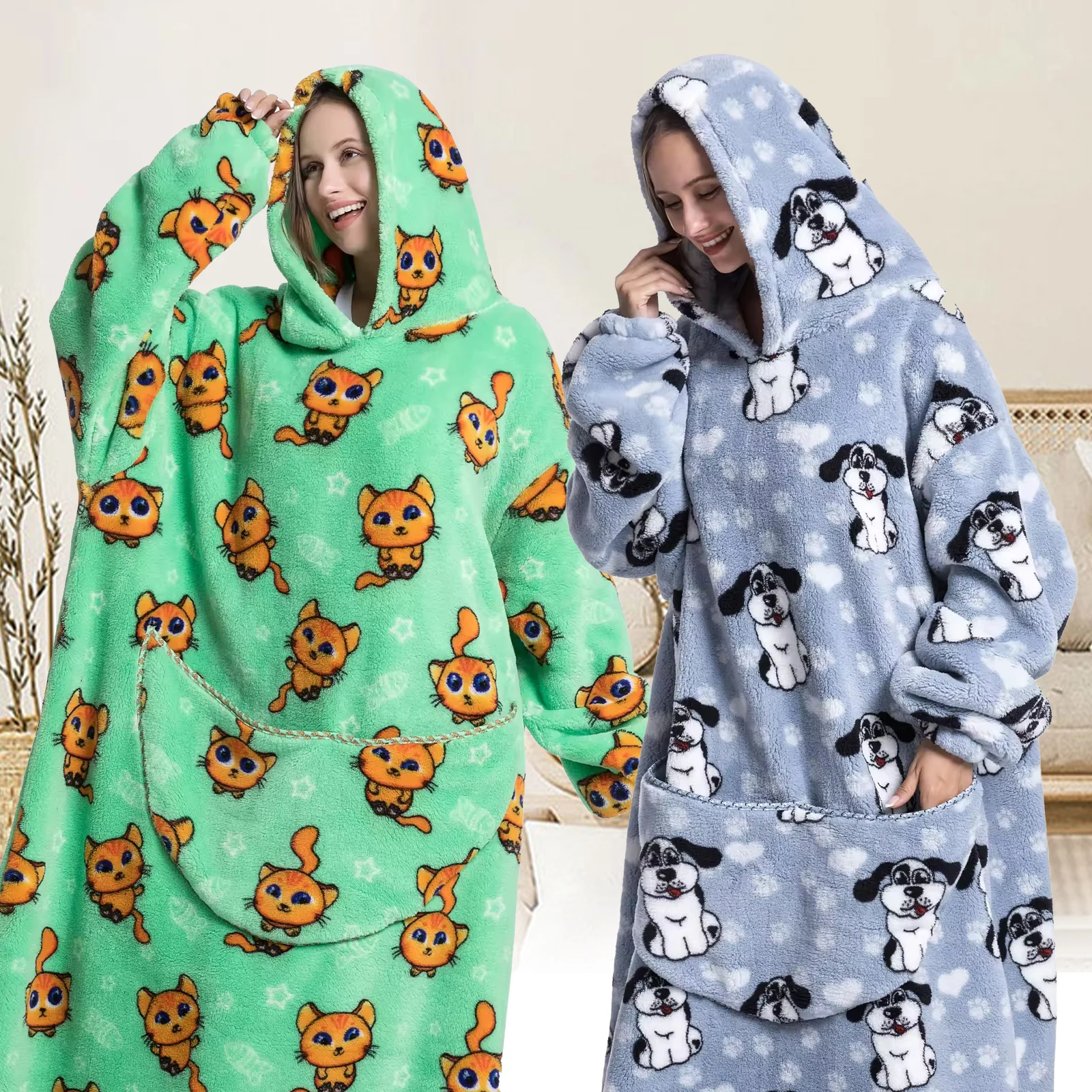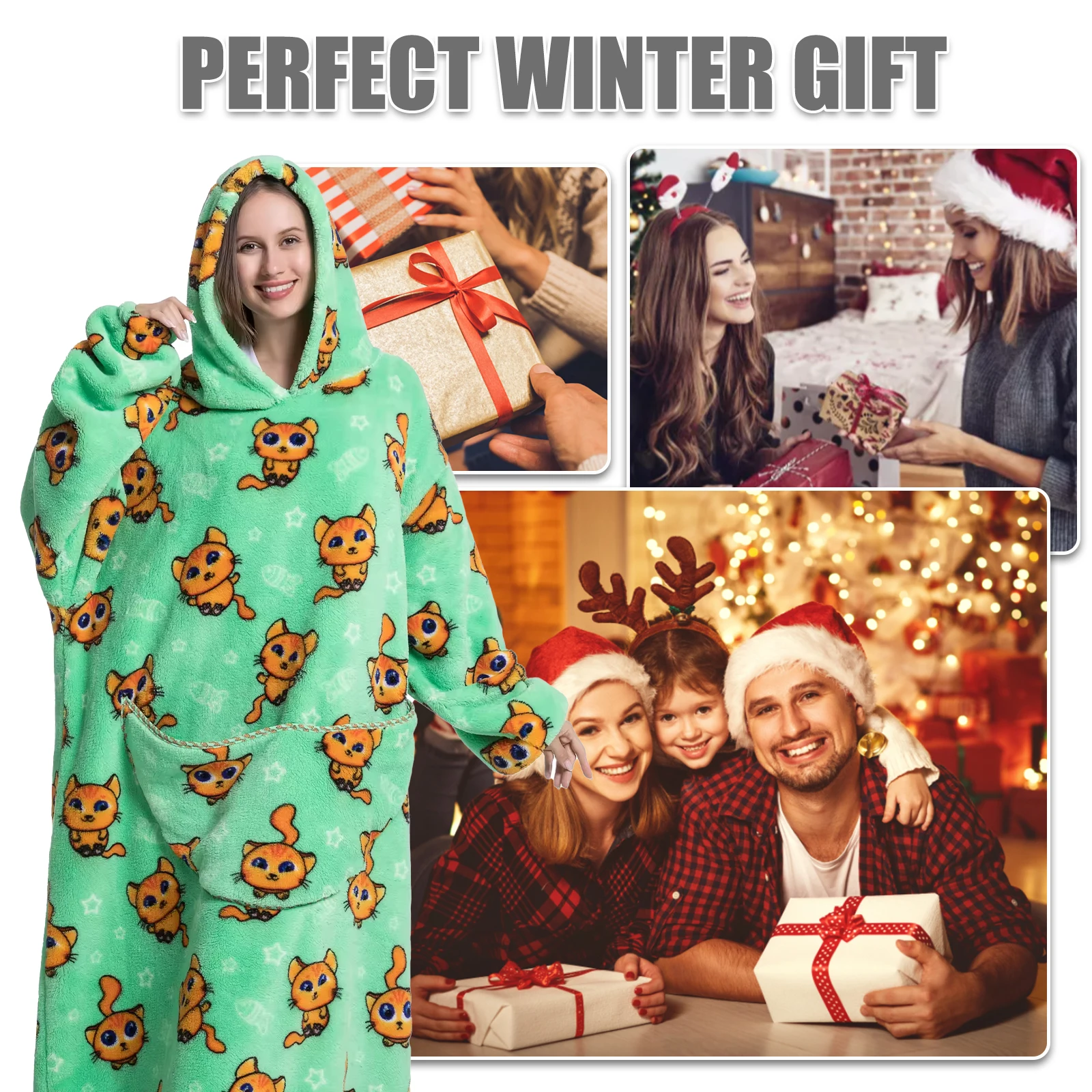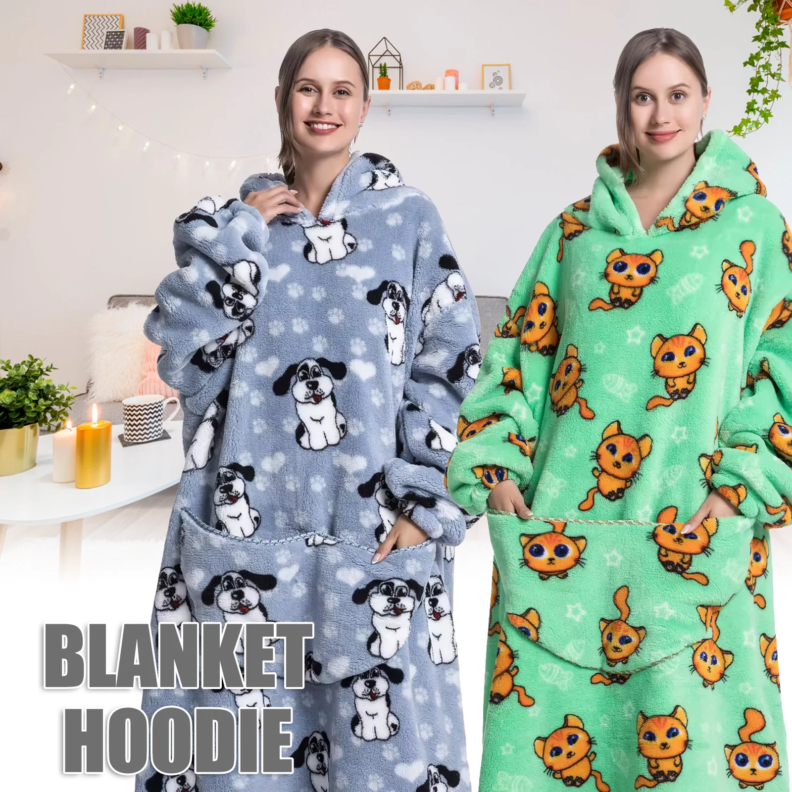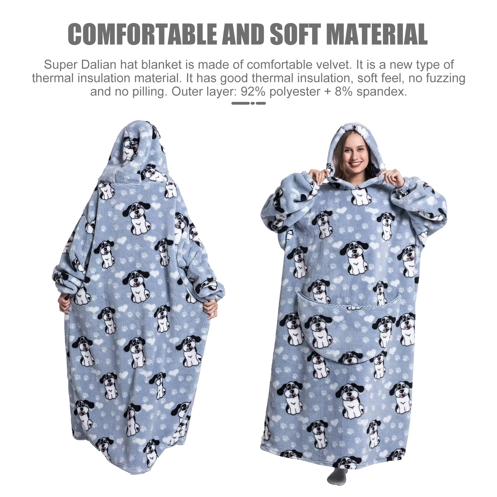 Stay cozy and warm with this oversized wearable hooded blanket sweatshirt, featuring cute cartoon prints. Perfect for men and women, this hooded blanket is great for lounging at home or staying warm on the go. The convenient dropshipping option makes it easy to order and receive your blanket hoodie without any hassle. This unique and practical item combines the comfort of a blanket with the style of a hoodie, making it a must-have for anyone looking to stay warm and stylish during colder months.