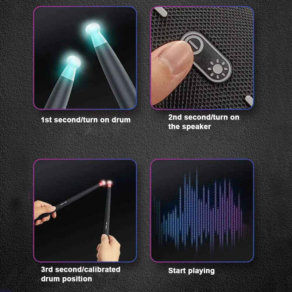 1. Advanced air drum technology for realistic drumming experience with simulated sounds: The portable air electronic drum utilizes cutting-edge motion sensing technology and algorithms to replicate the drumming positions of a traditional drum set. The built-in speakers mimic the sound of a real drum kit, providing an immersive and realistic drumming experience.