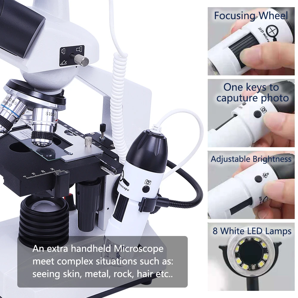 Extra handheld microscope meet the amplification requirements in complex situations, such as: seeing skin, metal, rock, hair, circuit board etc.. Support handheld microscope viewing on monitor, external to the computer real-time observation.