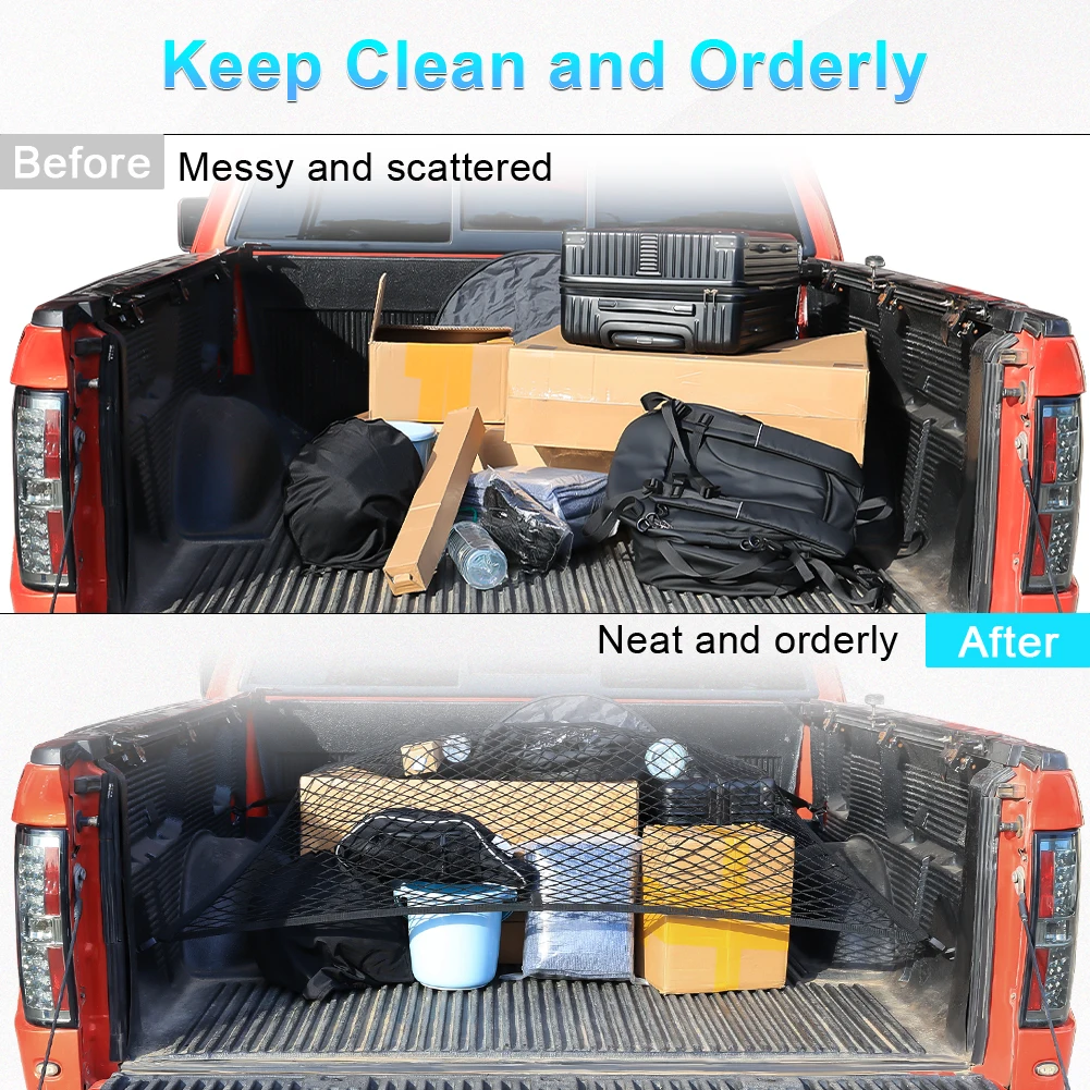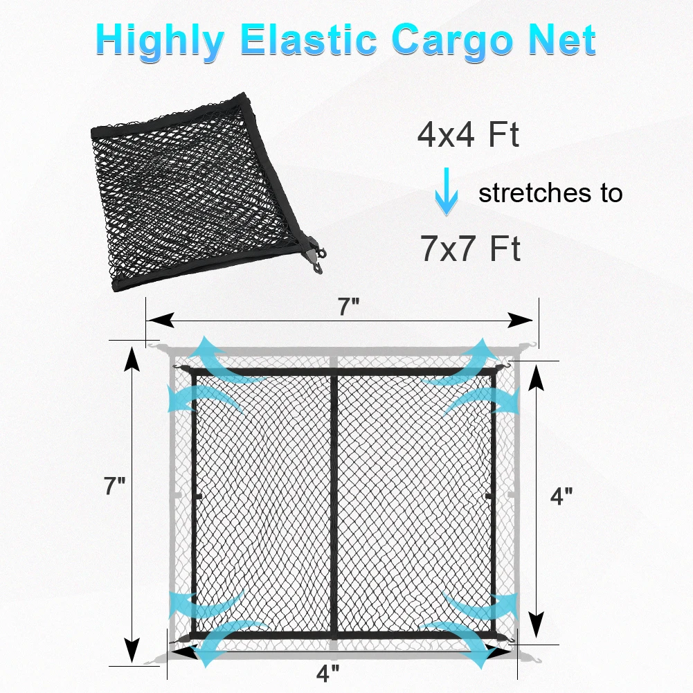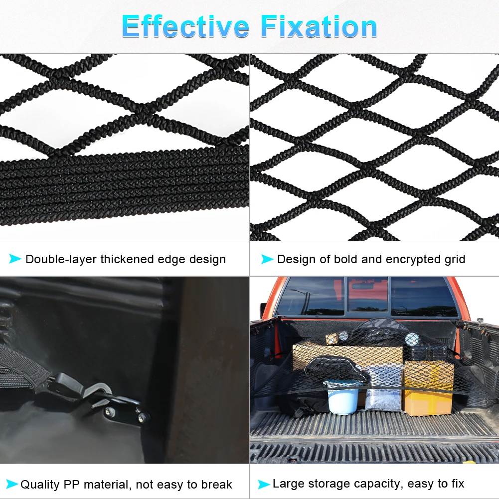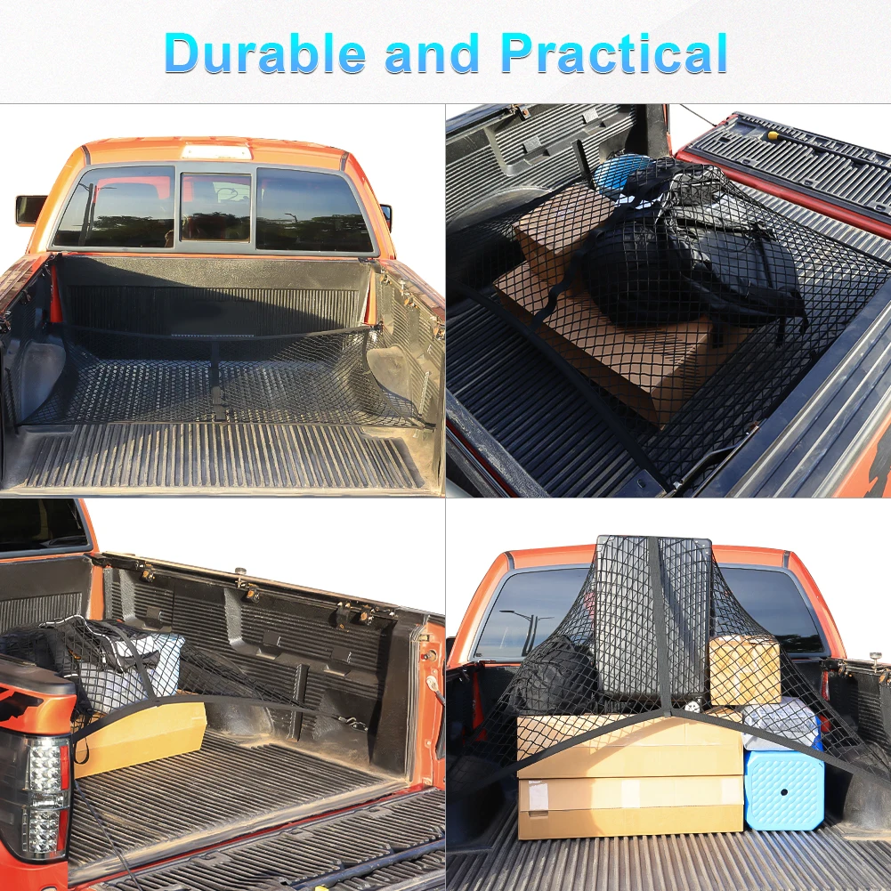 An elastic cargo net is designed for pickup trucks to organize and secure cargo in the truck bed. It is made of a durable mesh material and can be easily installed to create compartments for storing items. This floor-style trunk mesh cargo net is suitable for cars, SUVs, and pickup trucks to prevent items from shifting while driving. It provides a convenient solution for carrying various items in the vehicle without the risk of them falling or rolling around. The cargo net is adjustable to accommodate different sizes of cargo, providing a reliable and practical storage option for drivers.