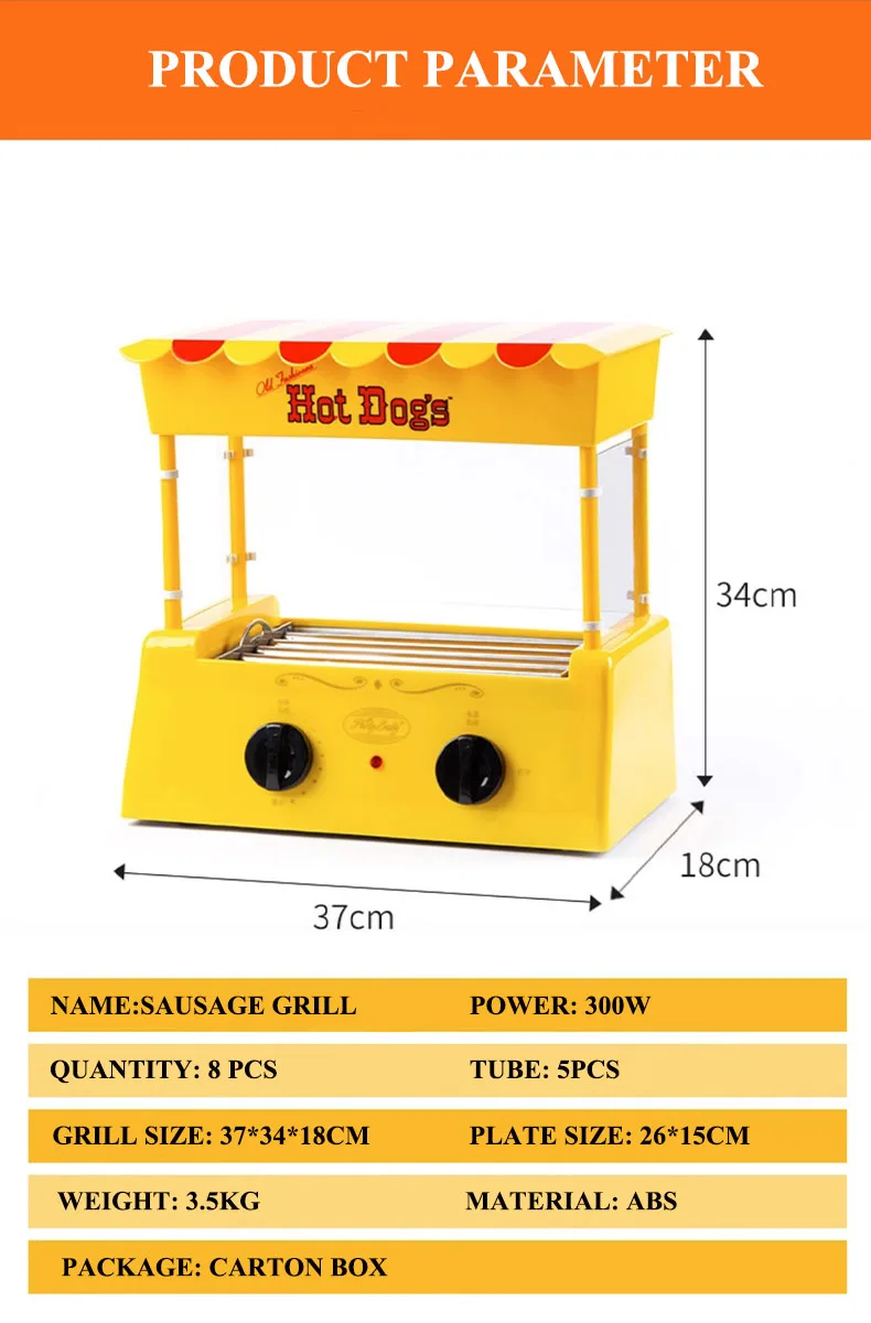 This content describes an electric sausage roaster machine that also functions as a hot dog bun warmer and hot dog roller grill with five rollers. The machine is designed to efficiently cook and warm sausage and hot dogs while also toasting the buns. It is a versatile appliance that can be used in various food service settings to prepare and serve hot dogs and sausages quickly and easily. The five rollers allow multiple items to be cooked simultaneously, making it ideal for high-volume operations.
