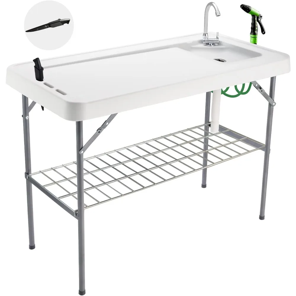 The folding fish cleaning table is a portable camping sink table that comes with a faucet, drainage hose, and sprayer. It is designed for outdoor use as a fish fillet cleaning station. The table can easily be folded for transportation and storage, making it convenient for camping trips or fishing excursions. The included faucet and sprayer allow for easy cleaning of fish and other items, while the drainage hose helps to keep the area clean and free of waste. This compact and practical table is a useful addition to any outdoor adventure.
